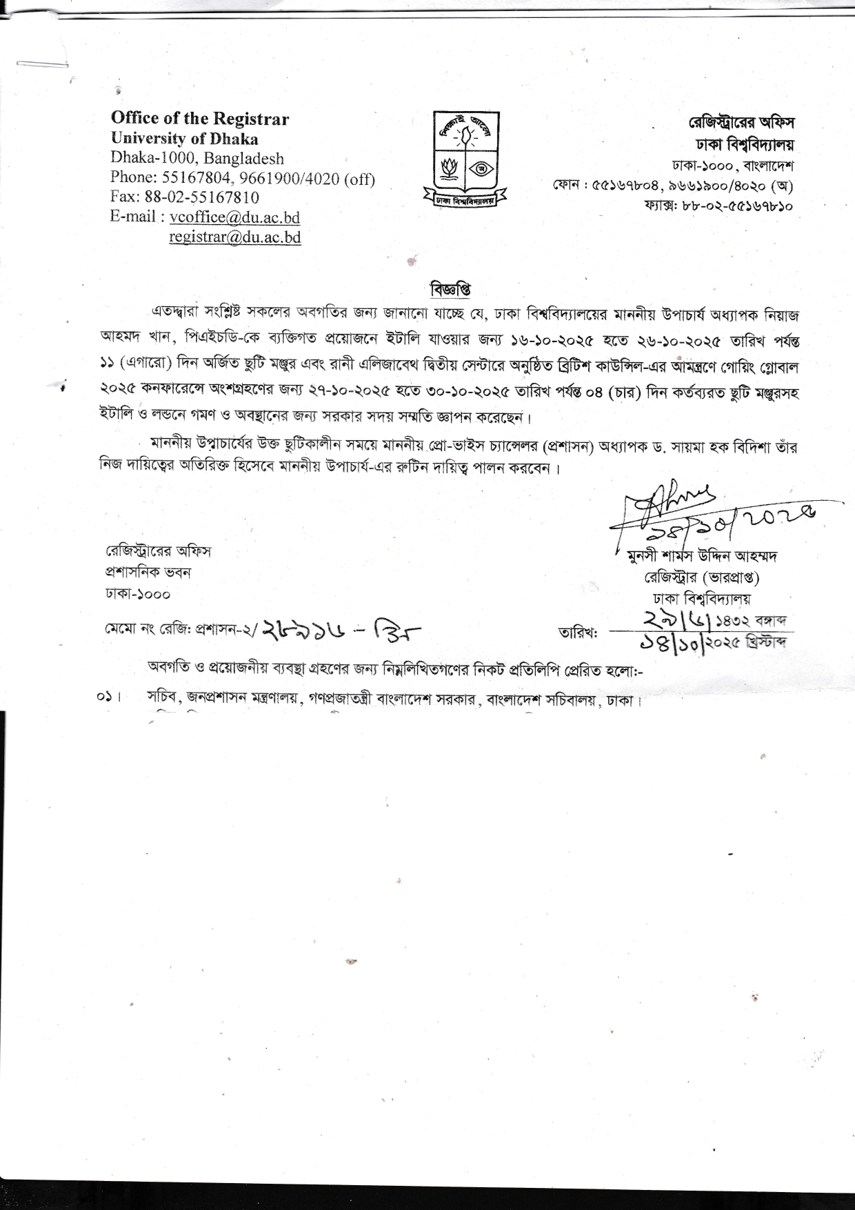 মাননীয় উপাচার্য অধ্যাপক নিয়াজ আহমদ খান, পিএইচডি স্যারের ছুটি প্রসঙ্গে