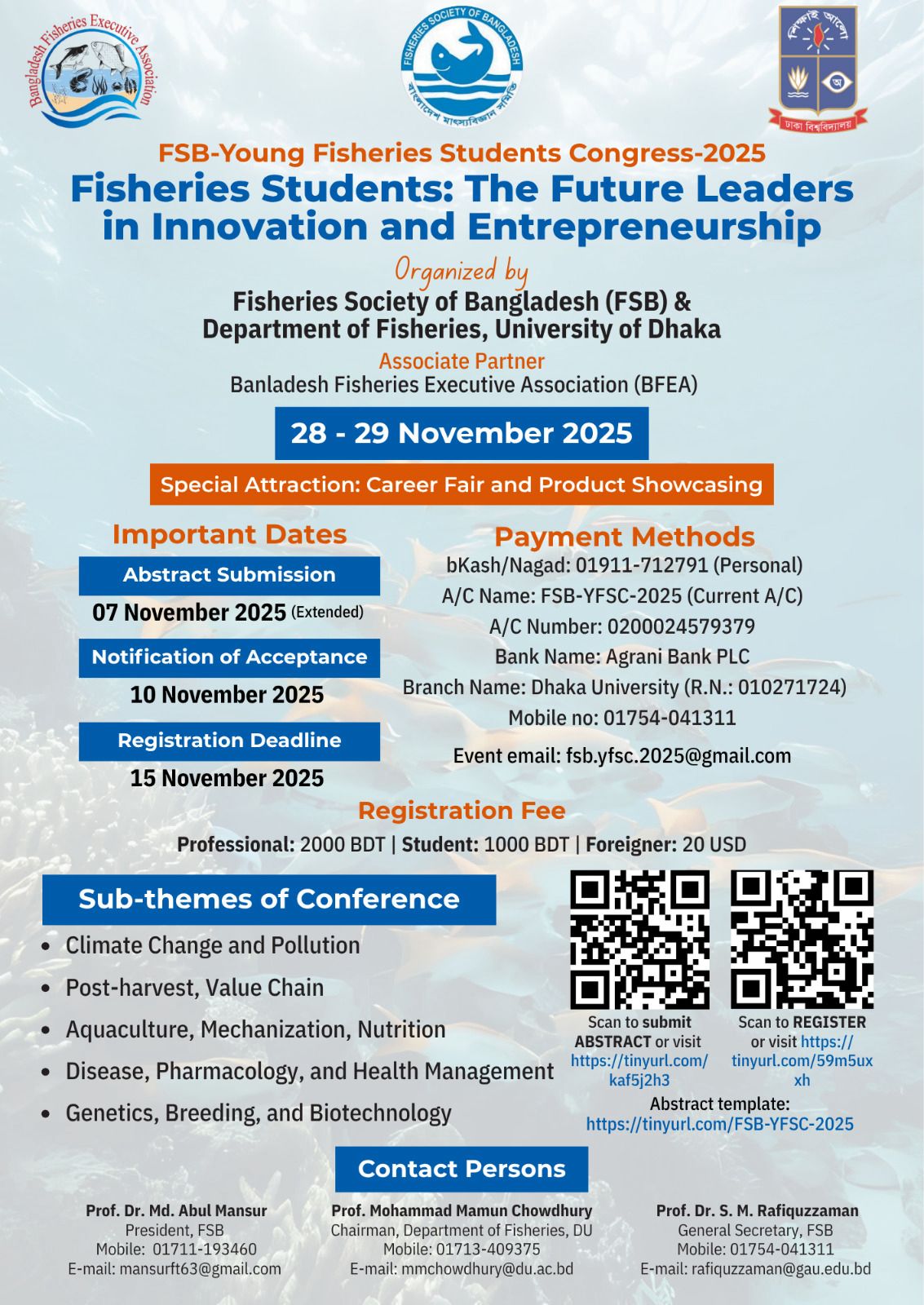 আগামী ২৮ ও ২৯ নভেম্বর ২০২৫ Young Fisheries Students Congress (YFSC)- 2025 অনুষ্ঠিত হবে