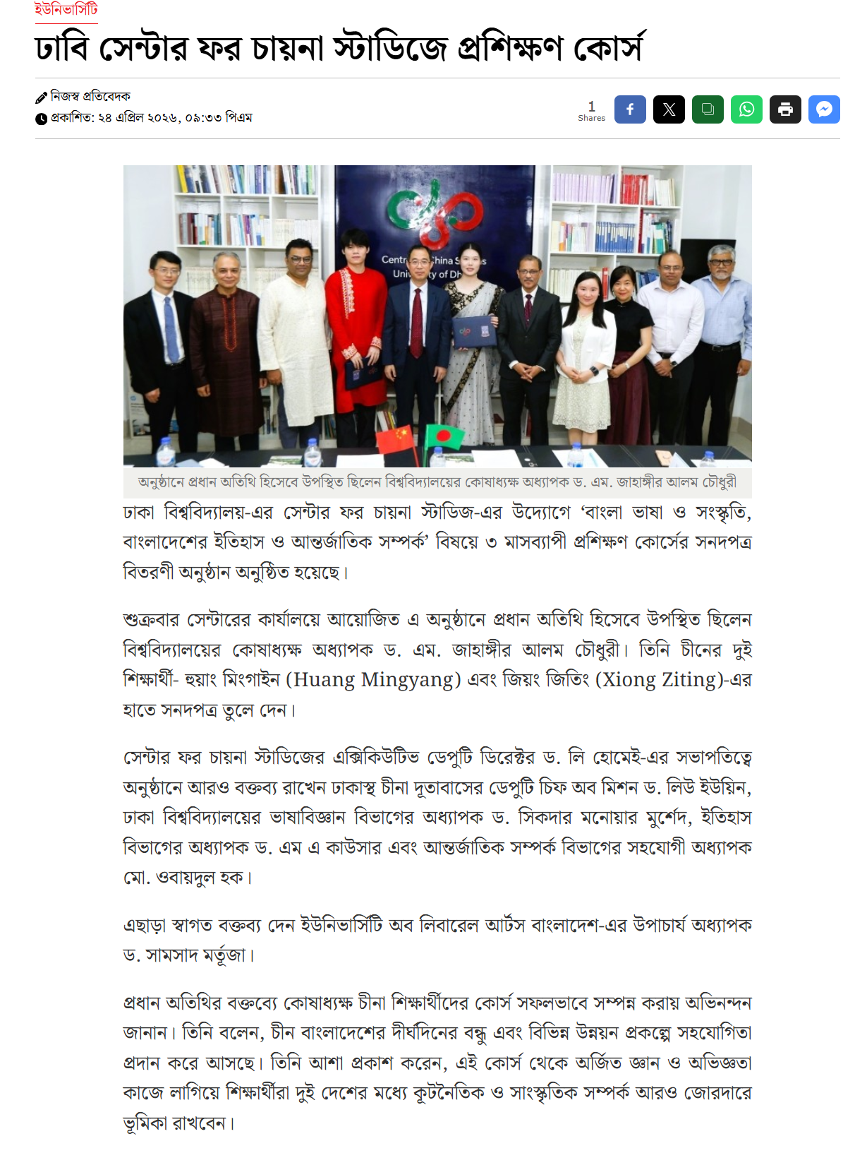 Certificate Course on Bengali Language and Culture for International Participants Organized by the University of Dhaka through the Centre for China Studies (CCS)
