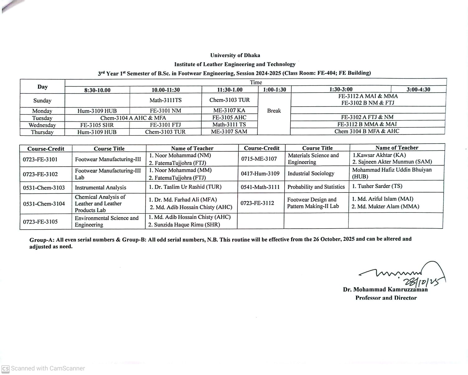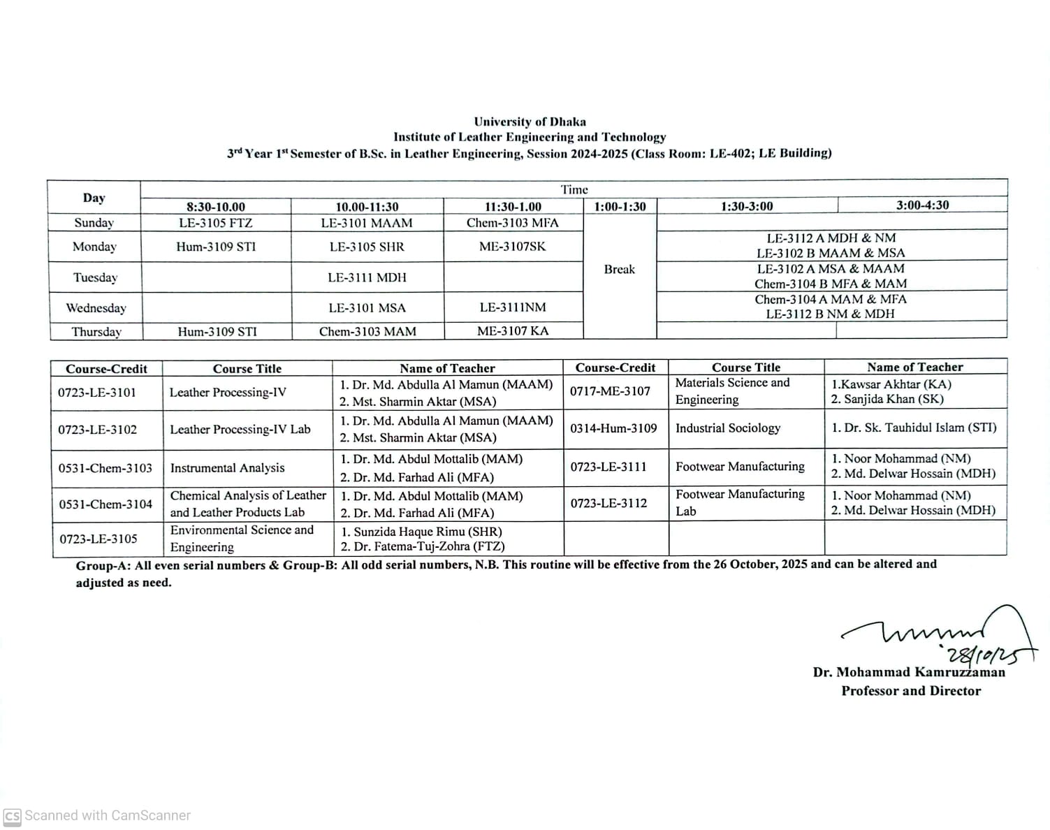 4th Year 1st Semester B.Sc. in LE/FE/LPE-2025: class routine