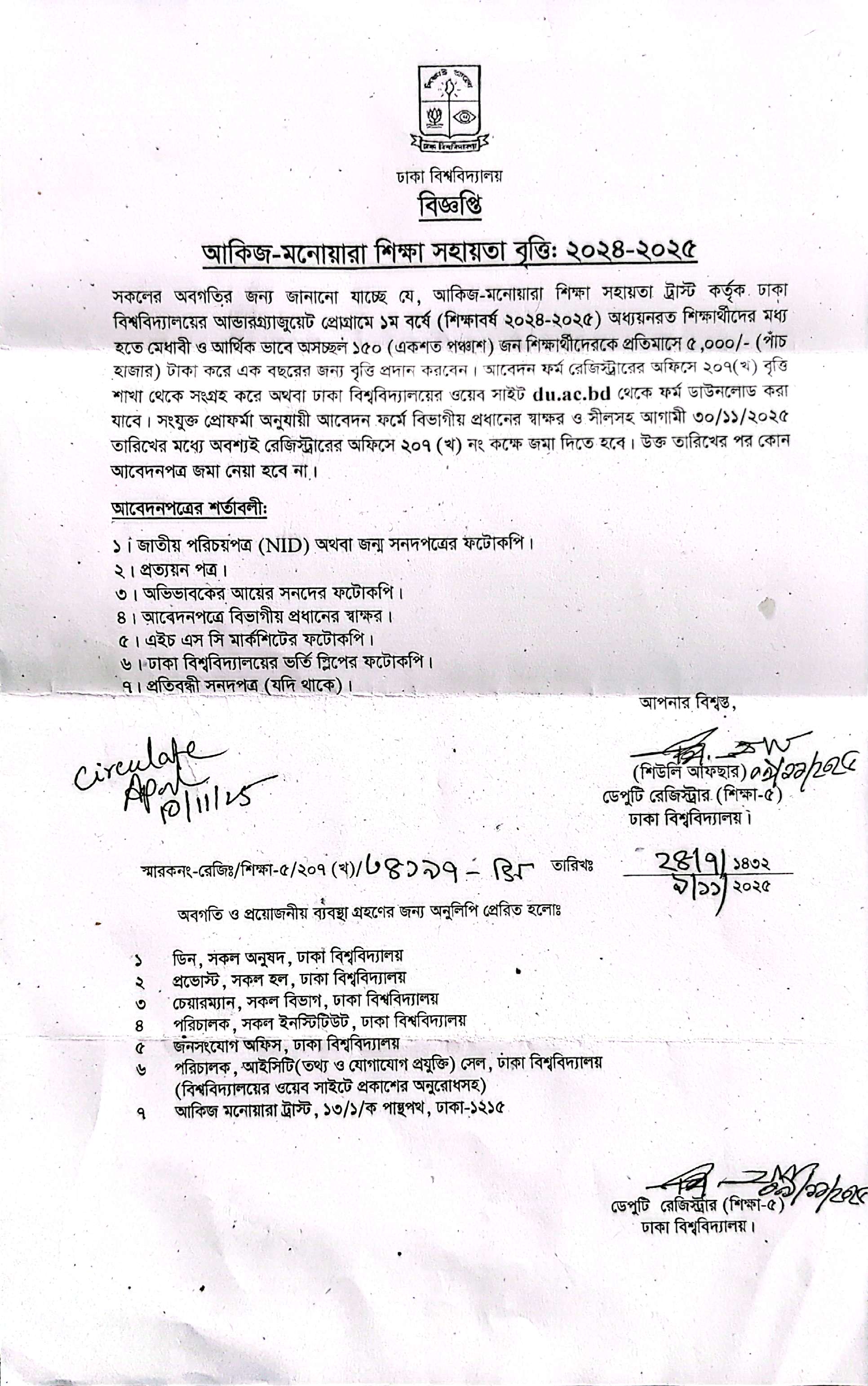আকিজ মনোয়ারা শিক্ষা সহায়তা বৃত্তি ২০২৪-২৫