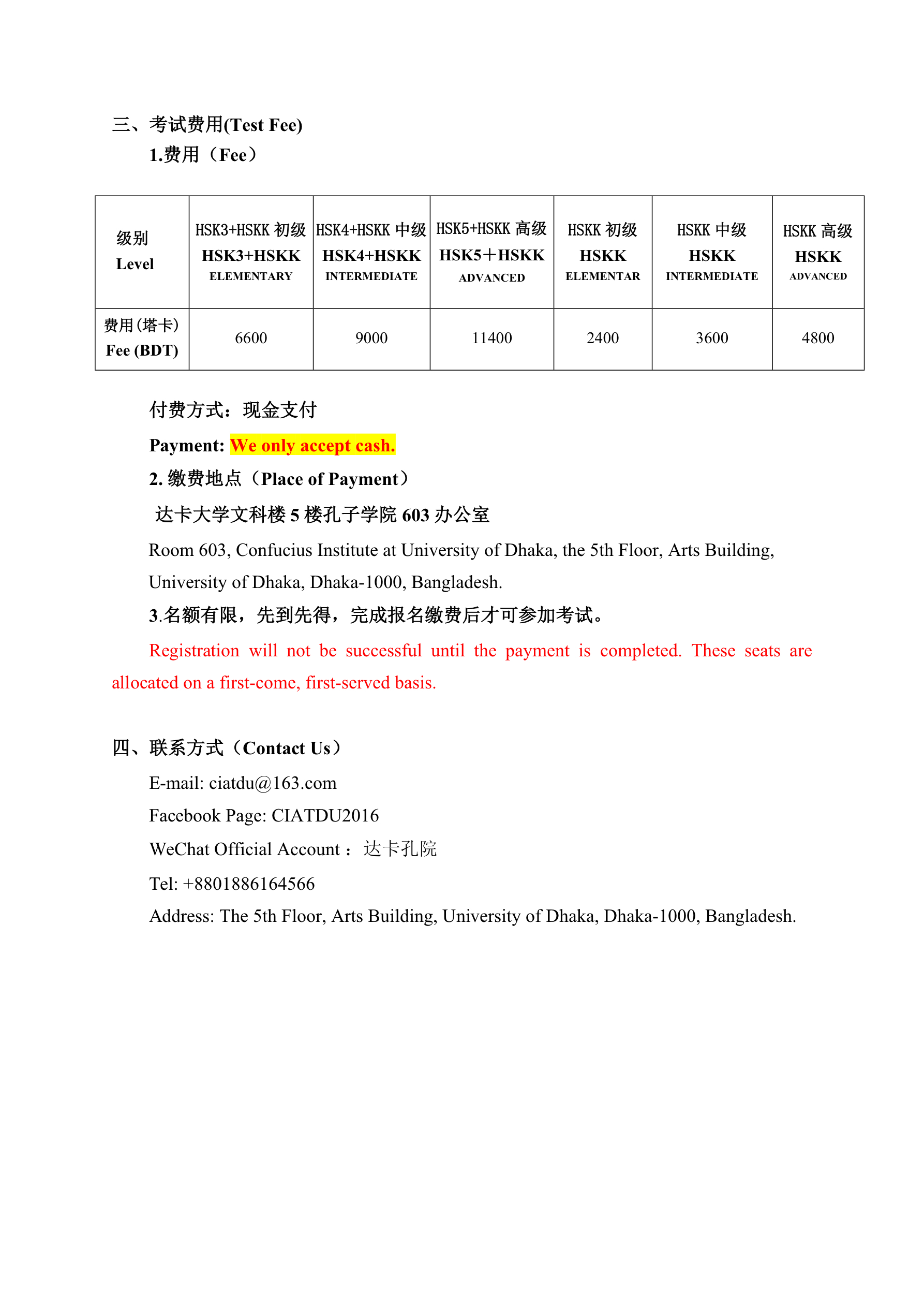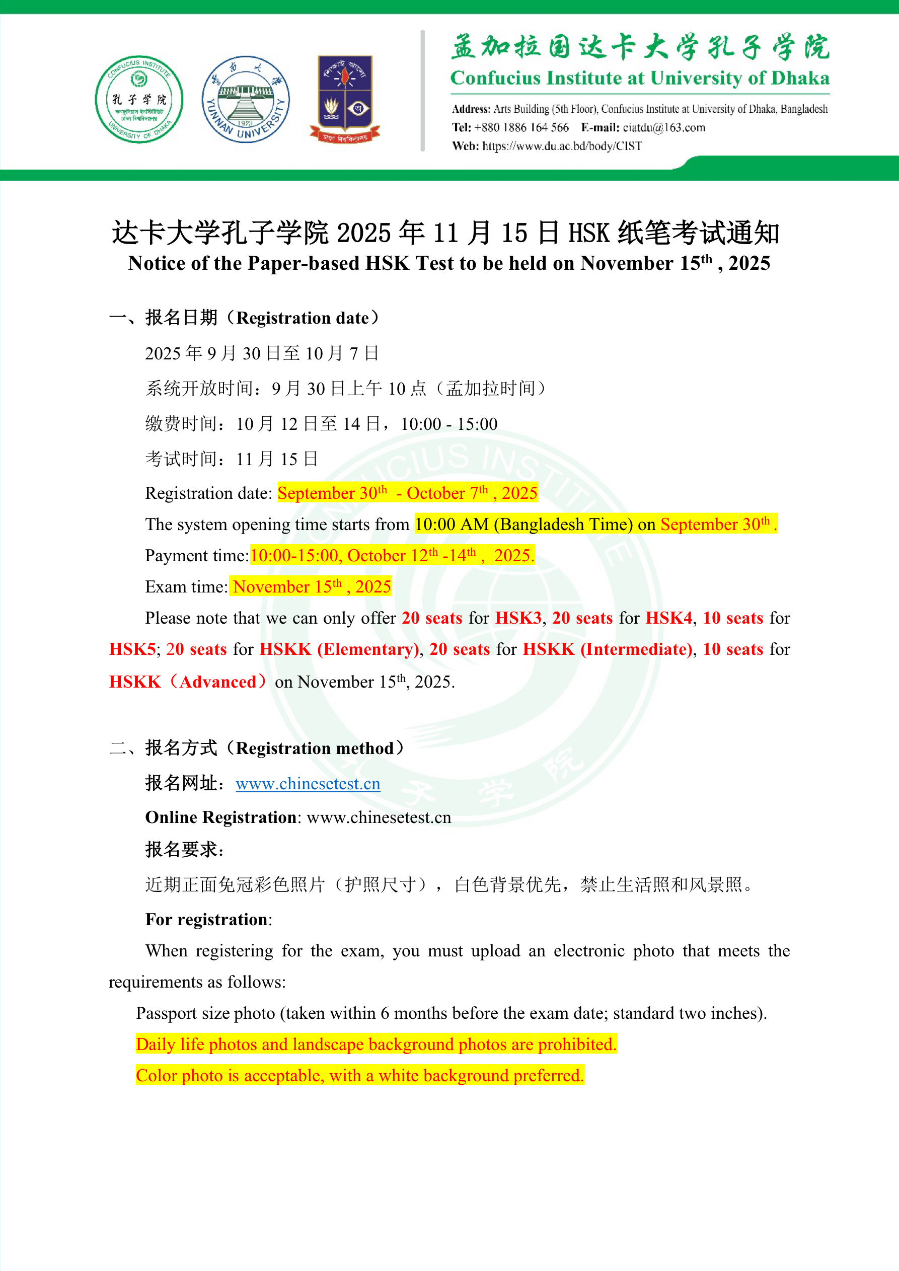 The Paper-based HSK Test will be held by Confucius Institute at University of Dhaka on 15th November , 2025. Please read the Notice carefully and prepare for the test. The examination quota is limited, please register as soon as possible!
