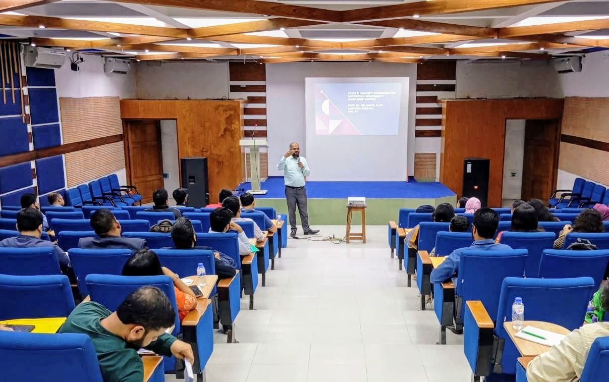 ঢাকা বিশ্ববিদ্যালয়ের মাননীয় ভাইস-চ্যান্সেলর অধ্যাপক নিয়াজ আহমদ খান, পিএইচডি “Research Integrity and Responsible Scholarship” বিষয়ে উচ্চশিক্ষা ও গবেষণায় সততা রক্ষার গুরুত্ব তুলে ধরে কর্মশালার শেষ সেশনটি পরিচালনা করেন।