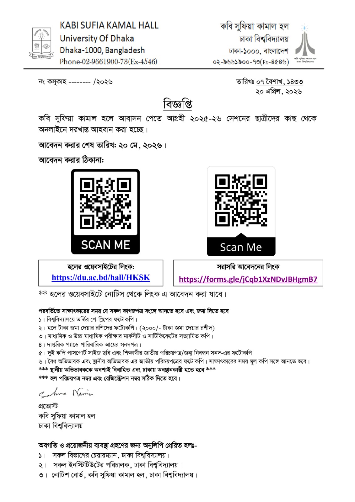 কবি সুফিয়া কামাল হলে আবাসন পেতে আগ্রহী ২০২৫-২৬ সেশনের ছাত্রীদের কাছ থেকে অনলাইনে দরখাস্ত আহবান করা হচ্ছে।