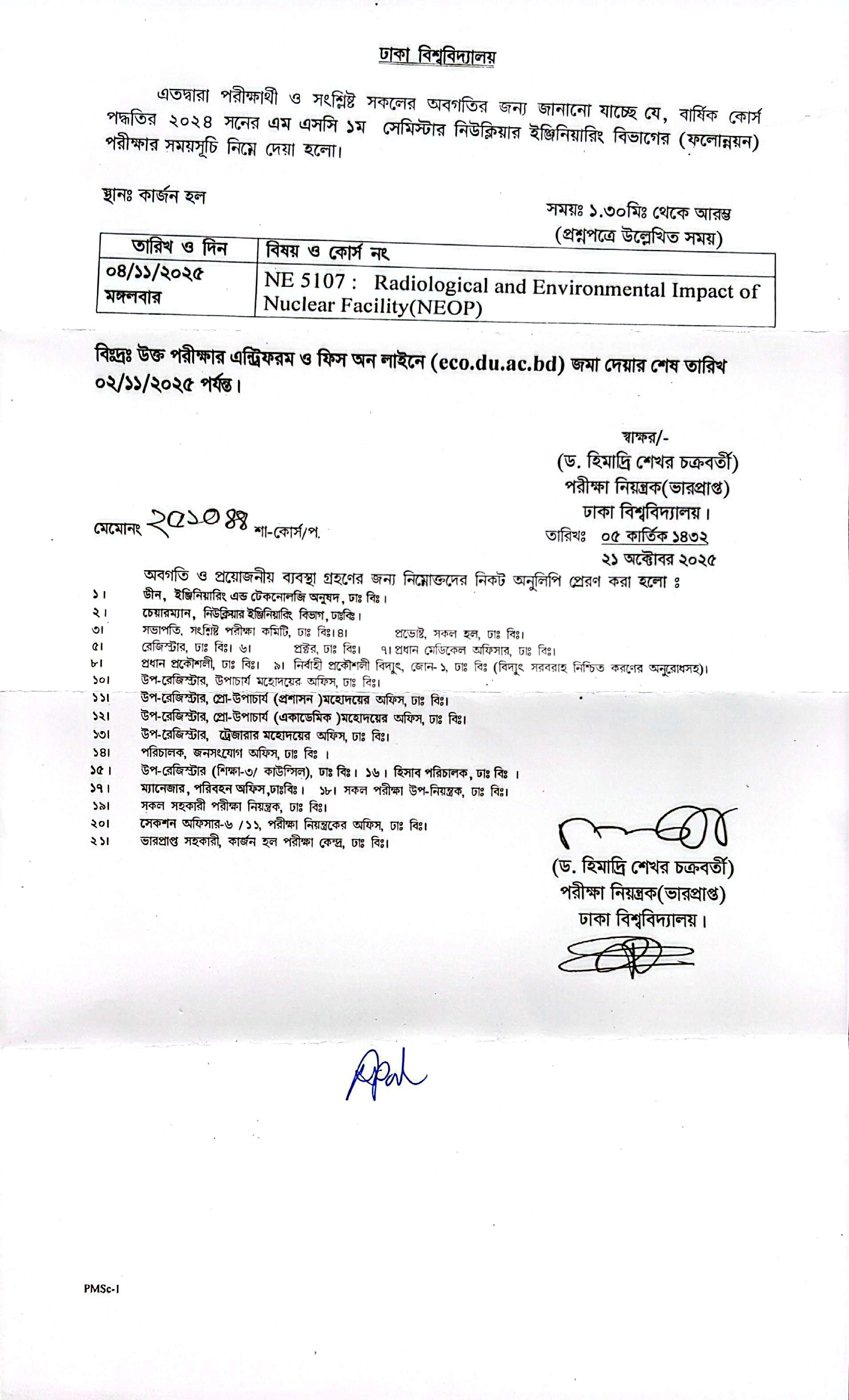 এম.এসসি. ১২তম ব্যাচ পূর্বের একটি কোর্সের ফাইনাল পরীক্ষার রুটিন