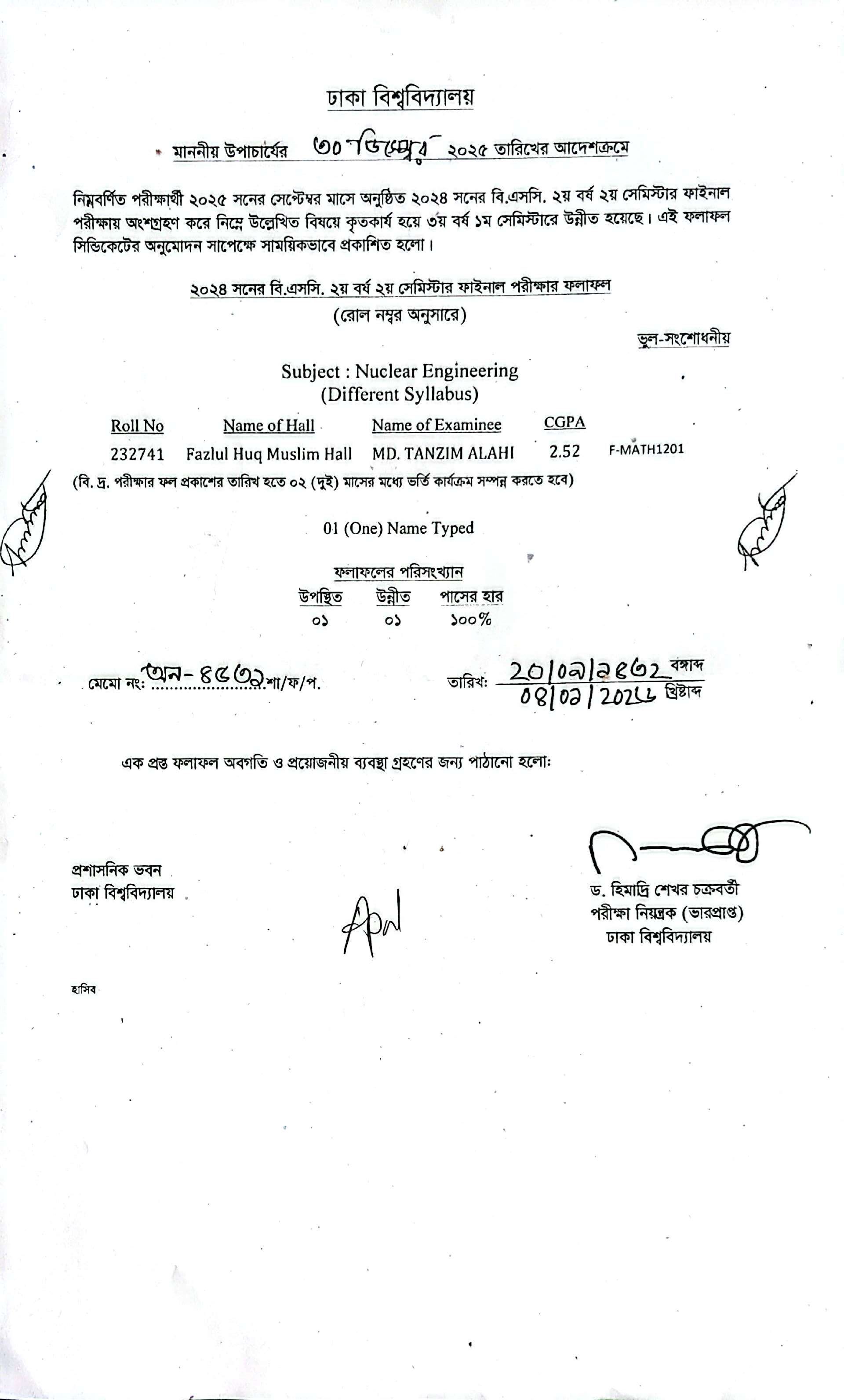 ২০২০ সনের এম.এসসি. ৩য় সেমিস্টার বিশেষ ফলোন্নয়ন পরীক্ষা ফলাফল
