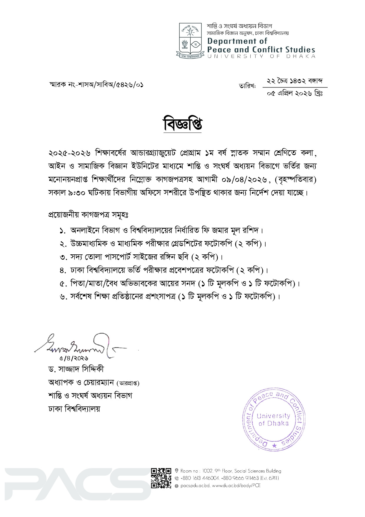 ২০২৫-২০২৬ শিক্ষাবর্ষের শান্তি ও সংঘর্ষ অধ্যয়ন বিভাগে মনোনয়নপ্রাপ্ত শিক্ষার্থীদের ভর্তি সংক্রান্ত