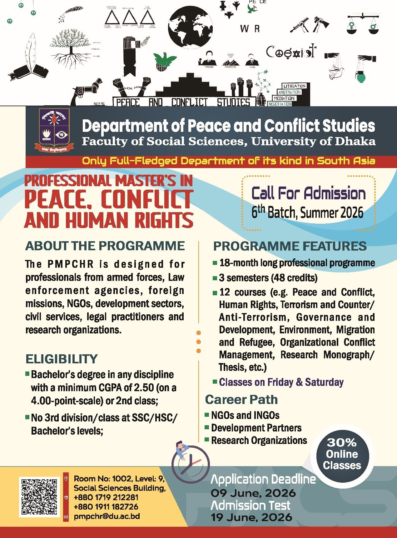 Call for Admission 6th Batch, Summer 2026- Professional Master's in Peace, Conflict and Human Rights, University of Dhaka