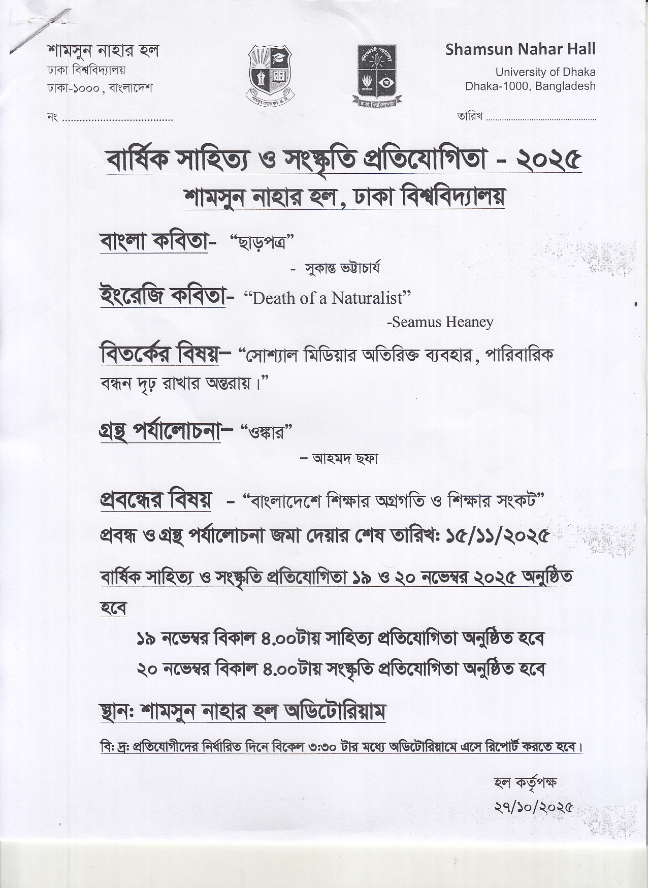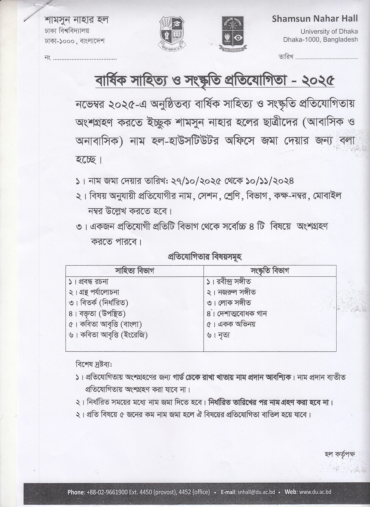 বিজ্ঞপ্তি: বার্ষিক সাহিত্য ও সাংস্কৃতিক প্রতিযোগিতা ২০২৫ (শামসুন নাহার হল)