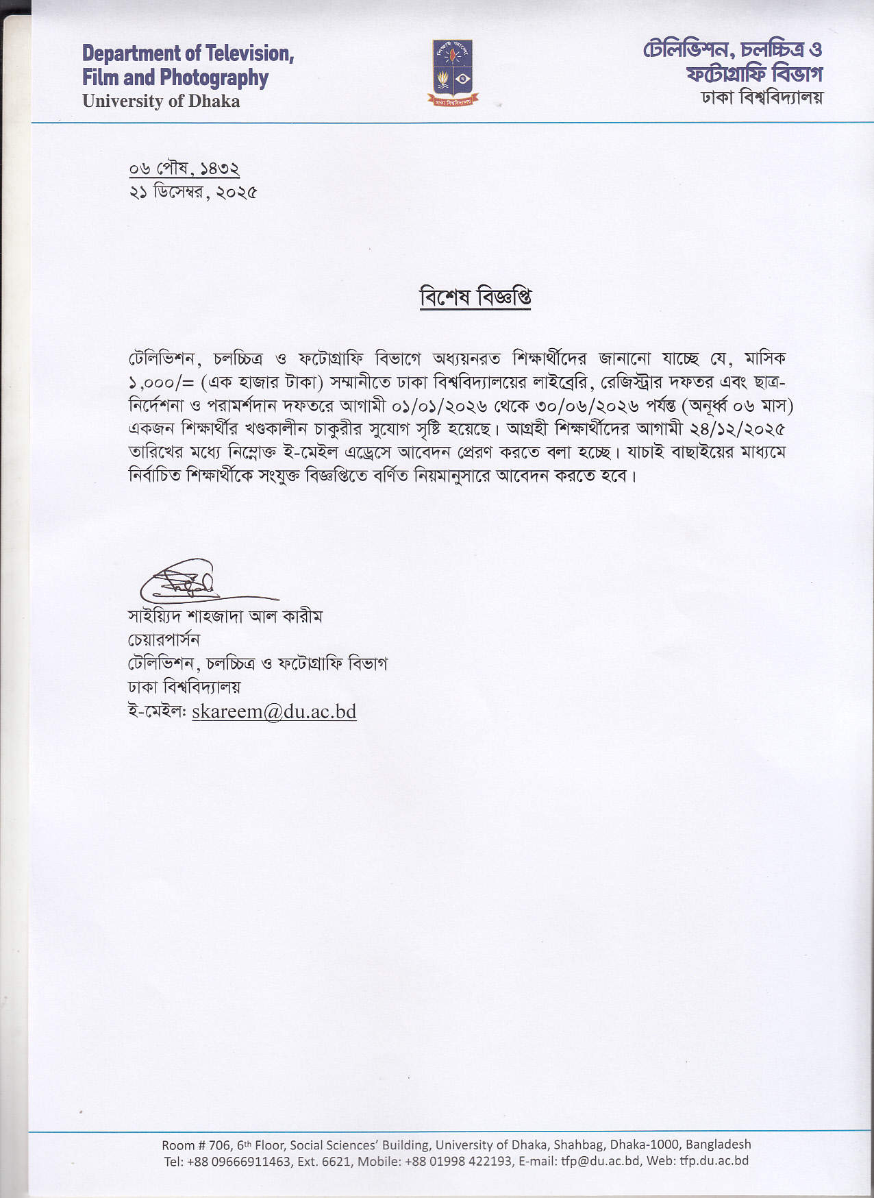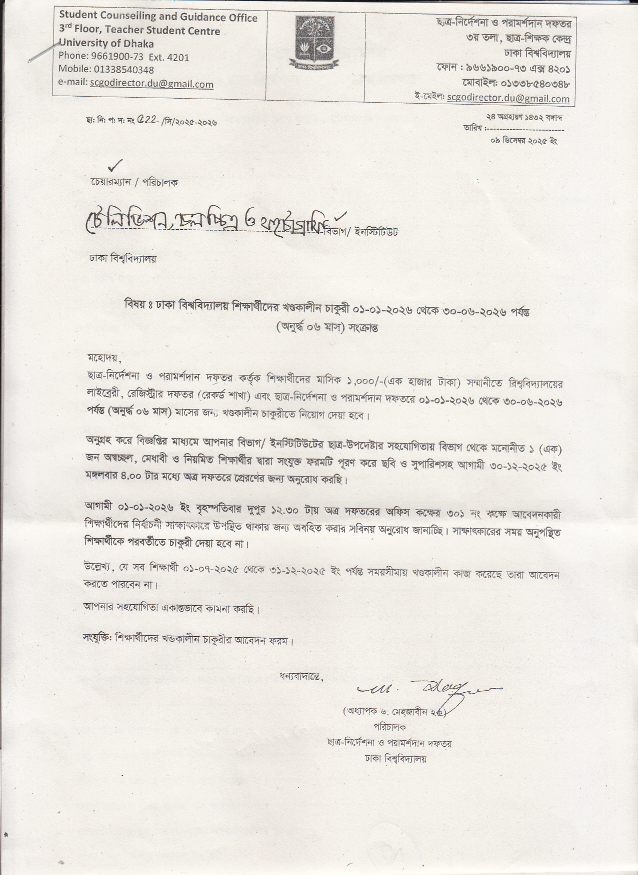 বিজ্ঞপ্তি: শিক্ষার্থীদের খন্ডকালীন চাকুরী সংক্রান্ত