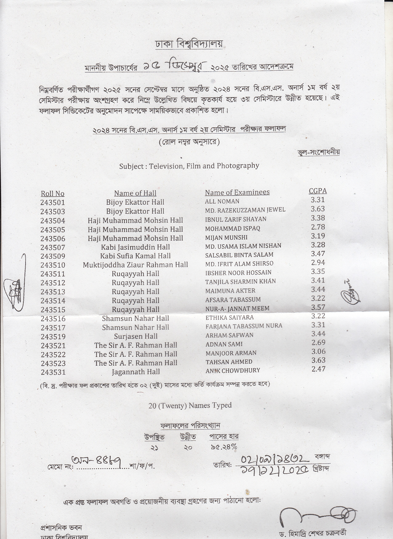 পরীক্ষার ফলাফল: বিএসএস ১ম বর্ষ ২য় সেমিস্টার