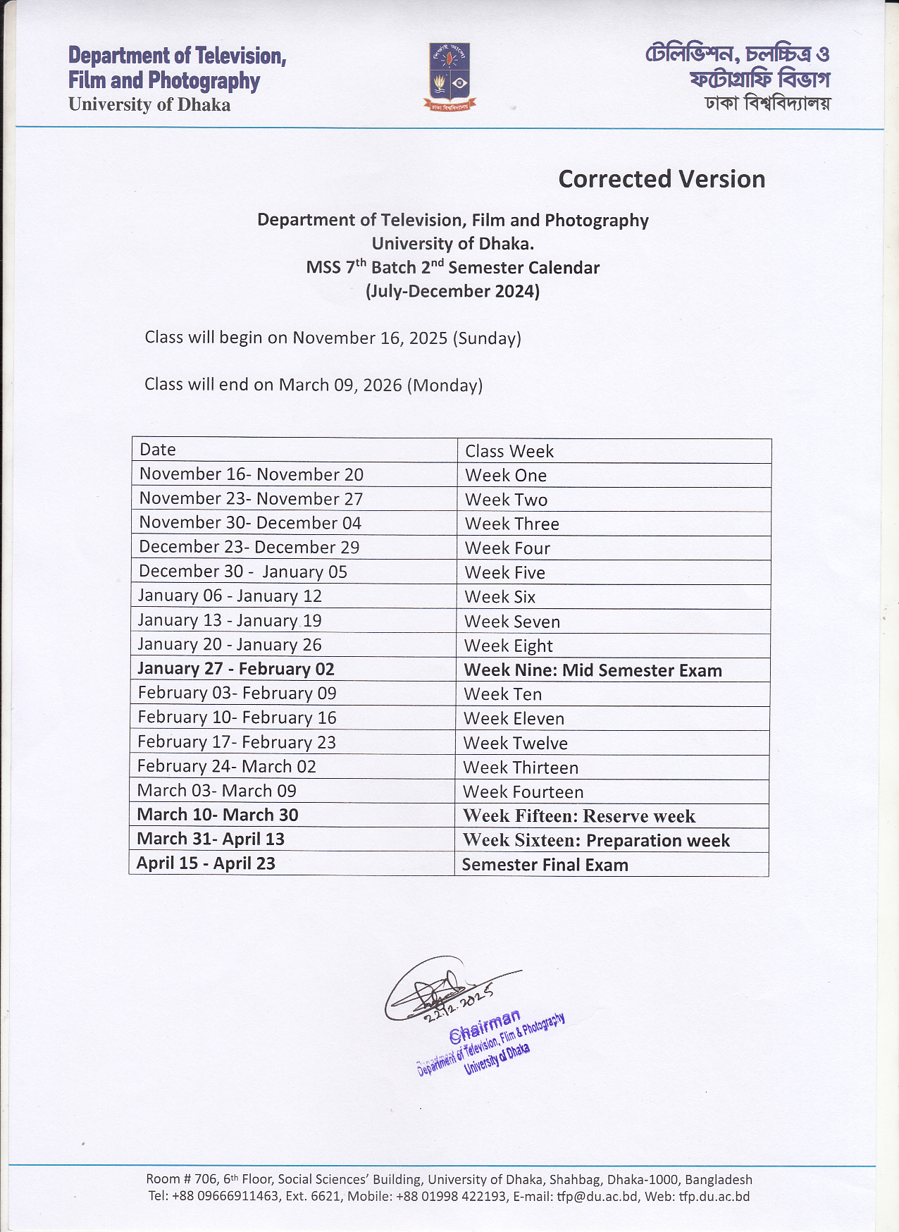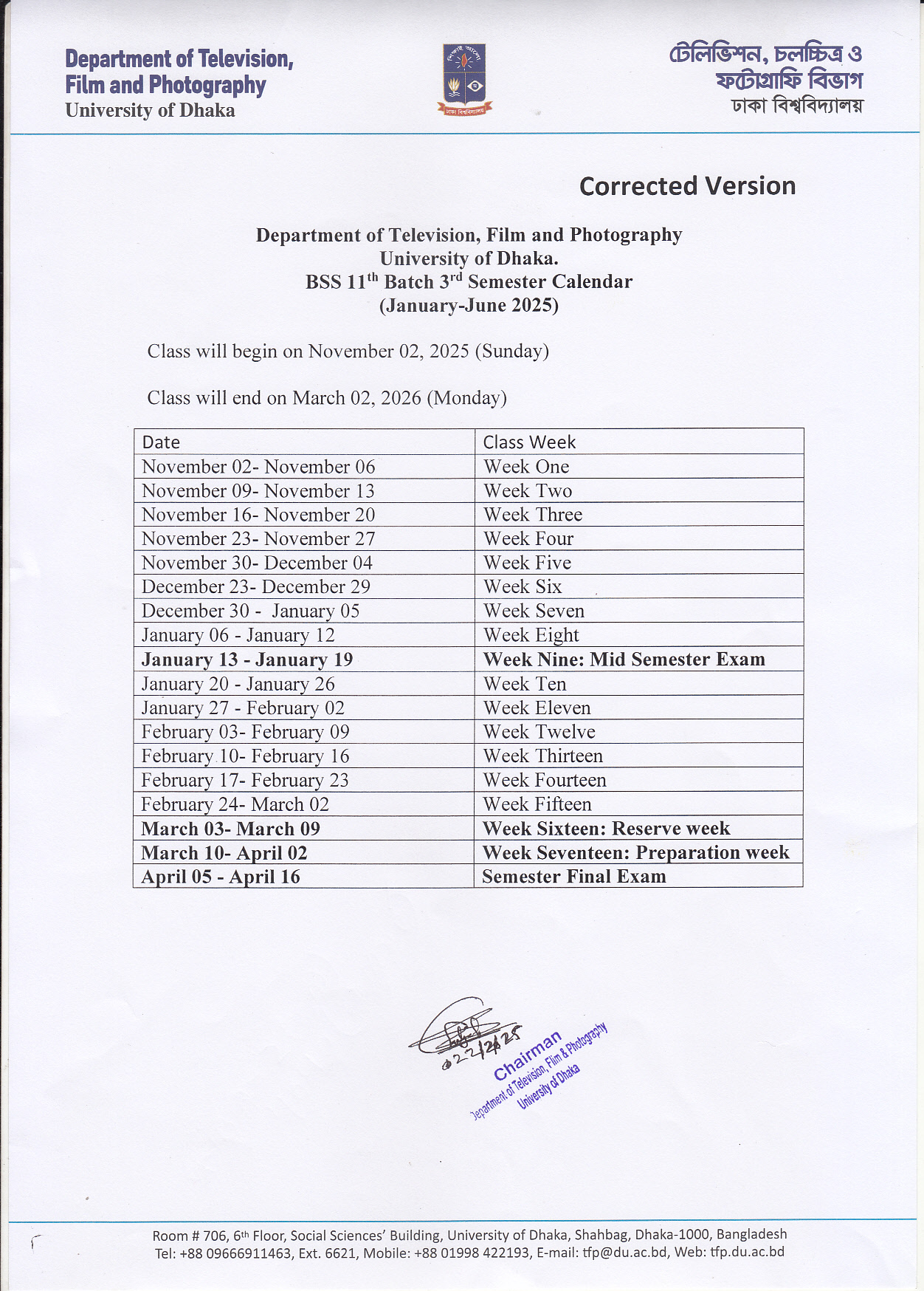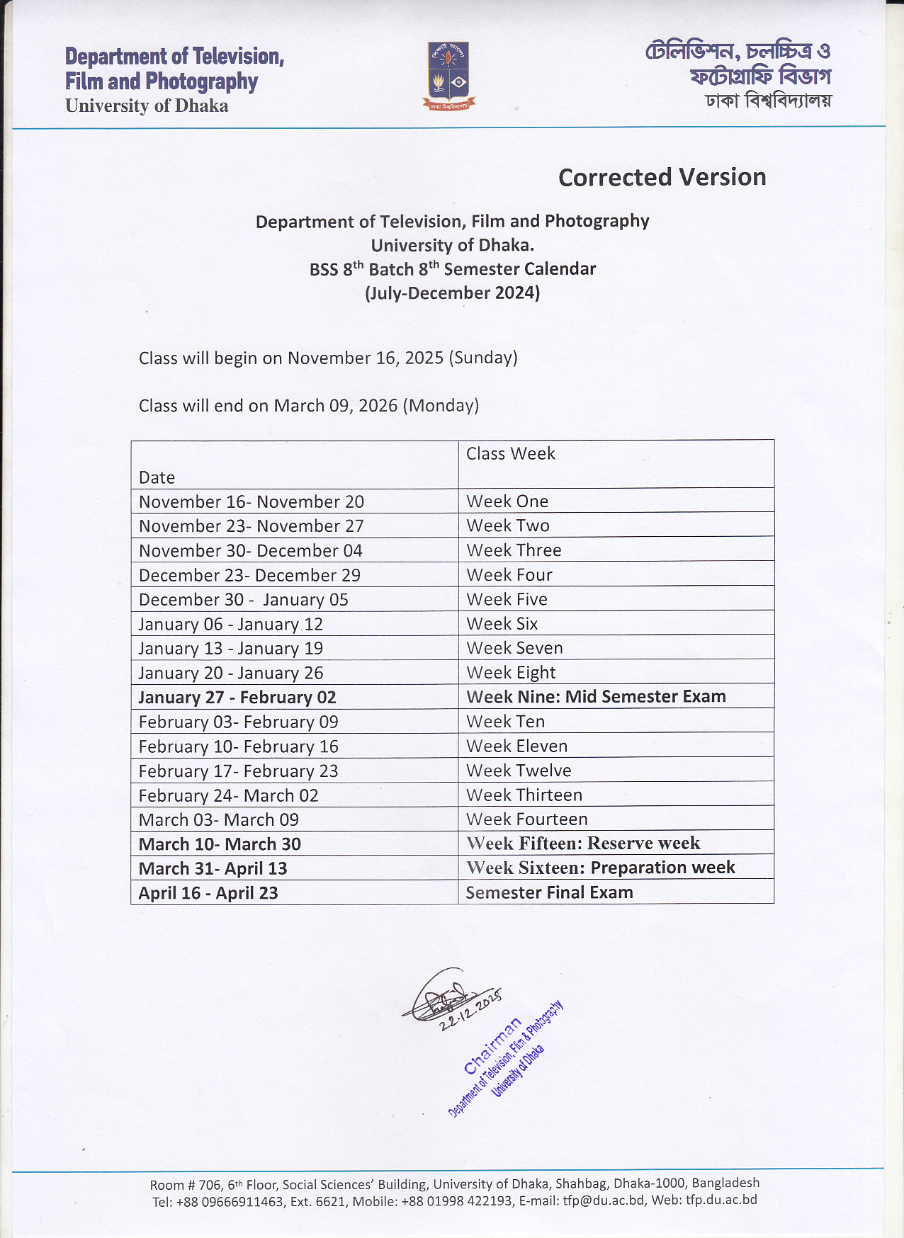 সেমিস্টার ক্যালেন্ডার: এমএসএস ৭ম ব্যাচ ২য় সেমিস্টার, বিএসএস ৭ম ব্যাচ ৮ম সেমিস্টার, বিএসএস ১১তম ব্যাচ ৩য় সেমিস্টার