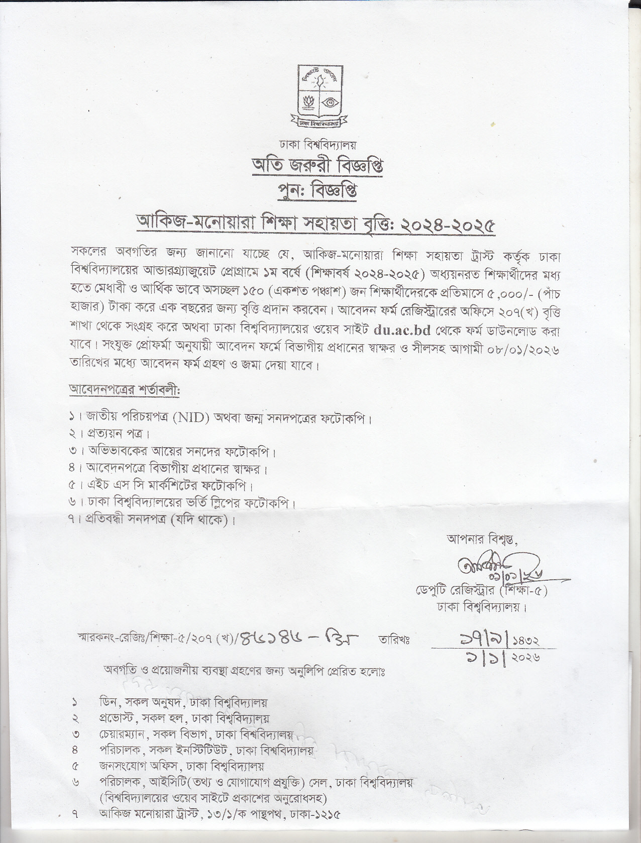 বিজ্ঞপ্তি: আকিজ-মনোয়ারা শিক্ষা সহায়তা বৃত্তি (২০২৪-২০২৫) - বিএসএস ১২ তম ব্যাচ