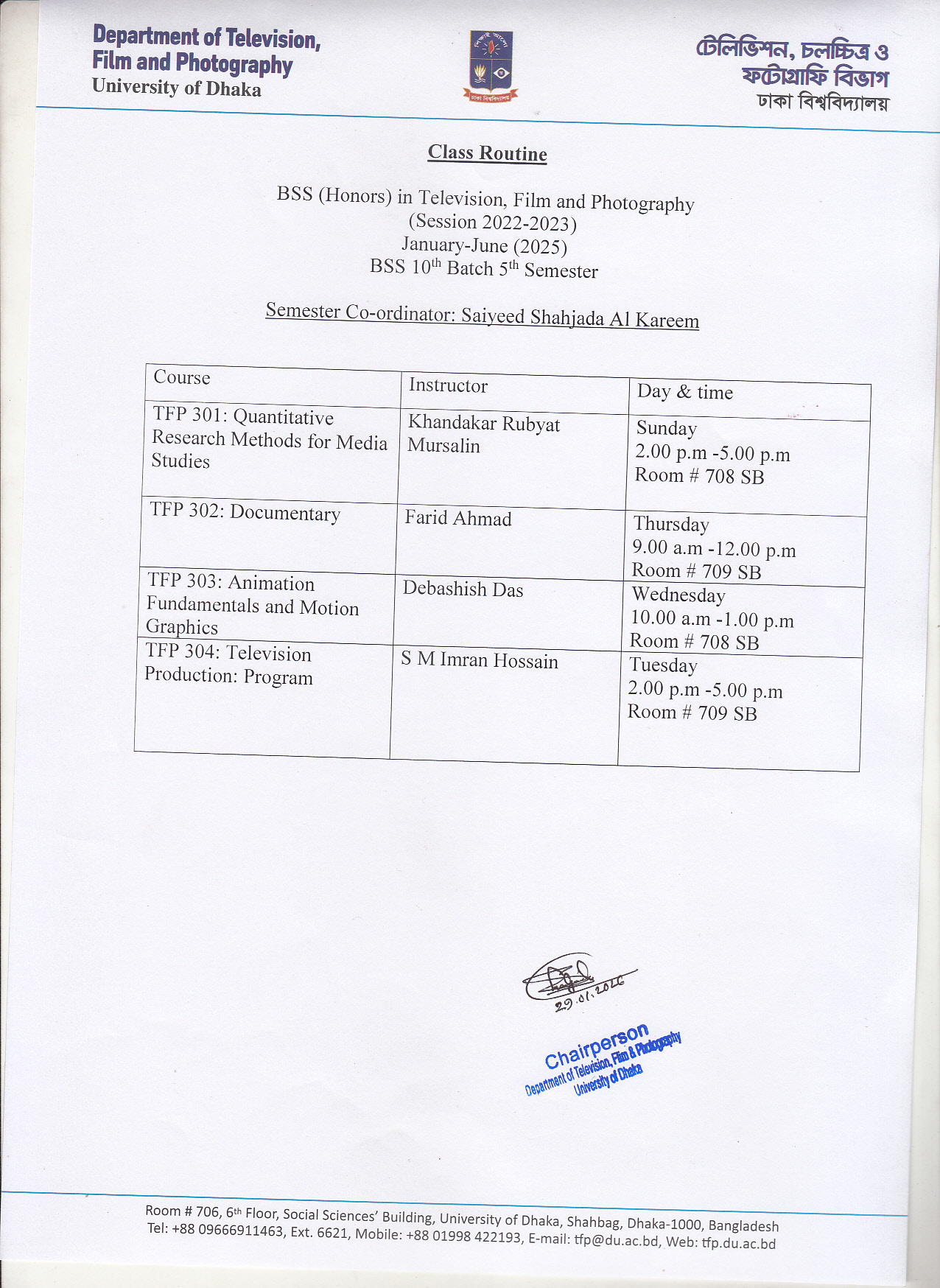 বিএসএস ১০ম ব্যাচ ৫ম সেমিস্টার: ক্লাস রুটিন ও সেমিস্টার ক্যালেন্ডার