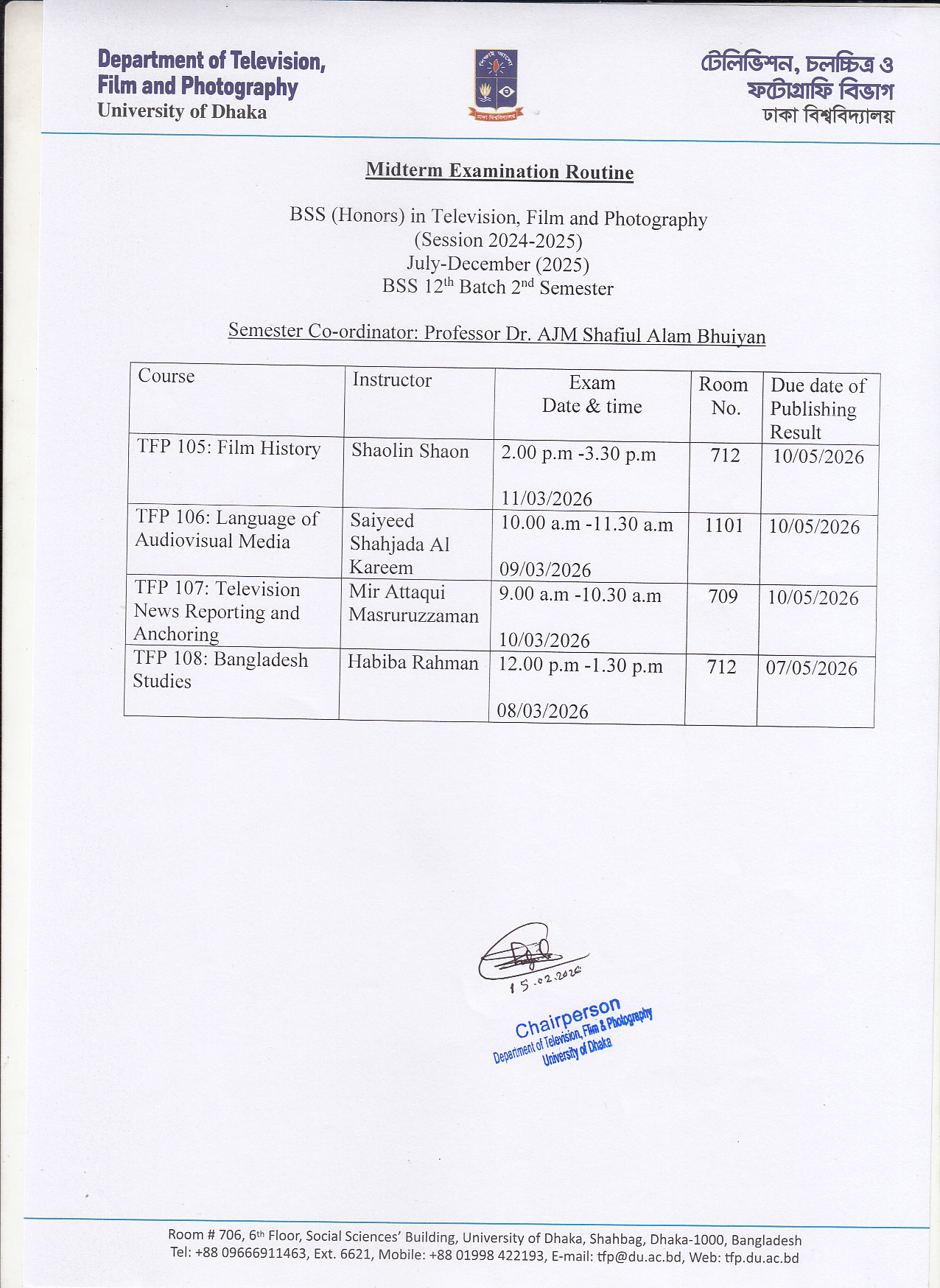 মিডটার্ম পরীক্ষার রুটিন: বিএসএস ১২তম ব্যাচ ২য় সেমিস্টার