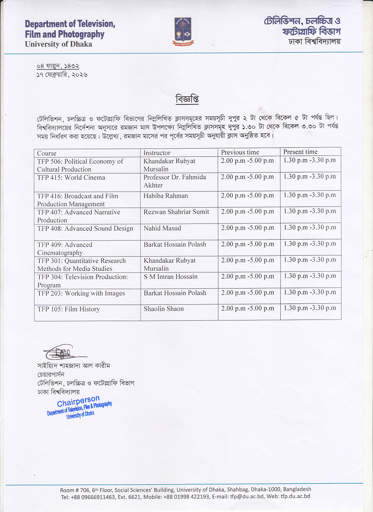 পবিত্র রমজান মাসে ক্লাসসমূহের নির্ধারিত সময়সূচি