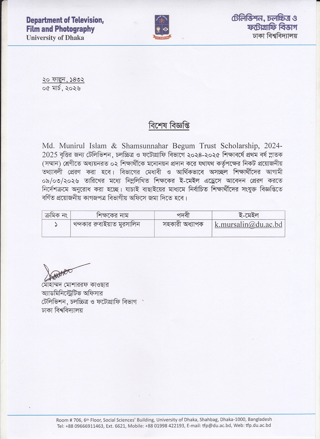২০২৩ সনের স্নাতক (সম্মান) পরীক্ষার ফলাফলের উপর বৃত্তিপ্রাপ্ত শিক্ষার্থীদের আবেদন সংক্রান্ত অতি জরুরী বিজ্ঞপ্তি