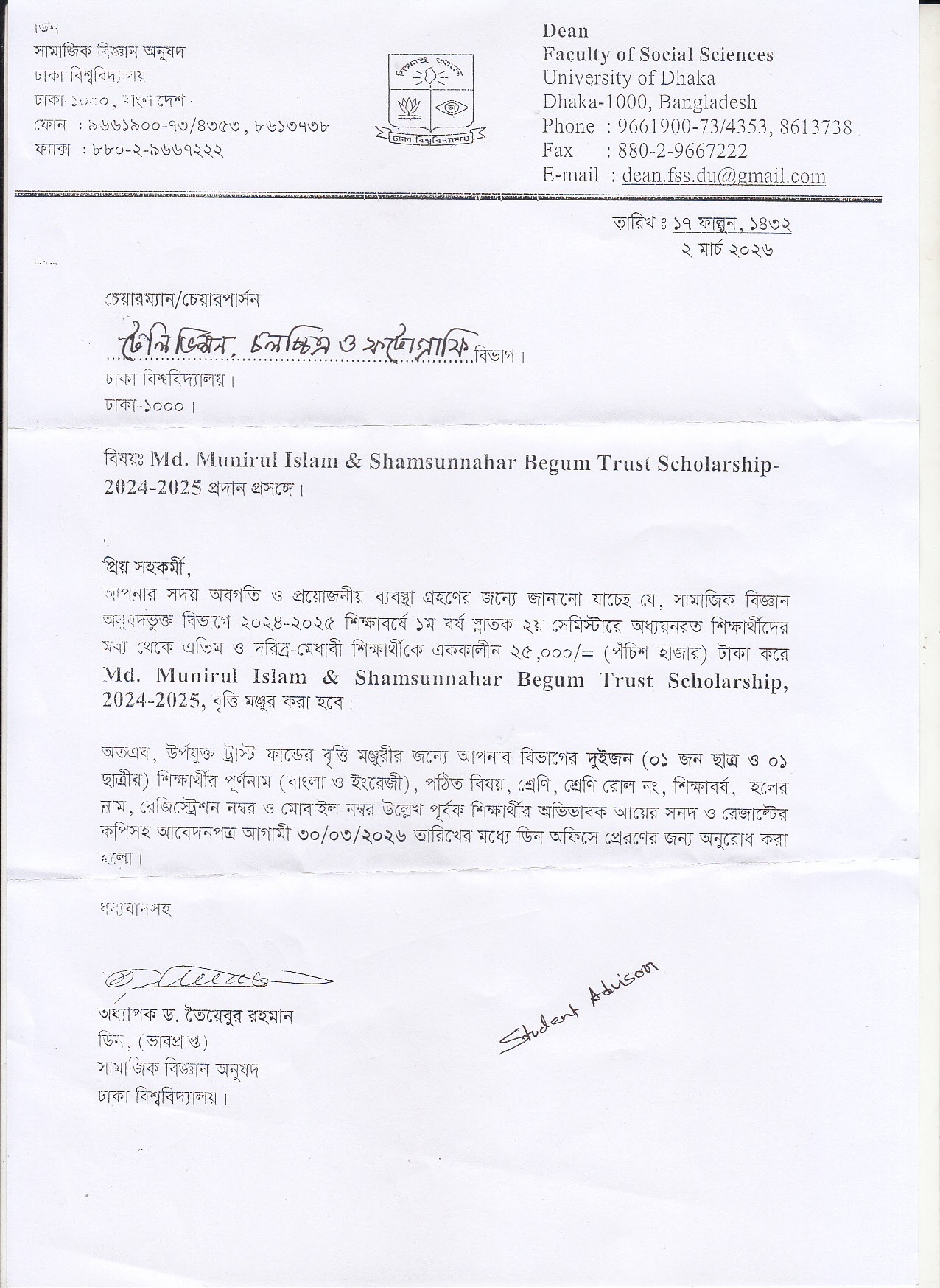 Md. Munirul Islam & Shamsunnahar Begum Trust Scholarship 2024-2025