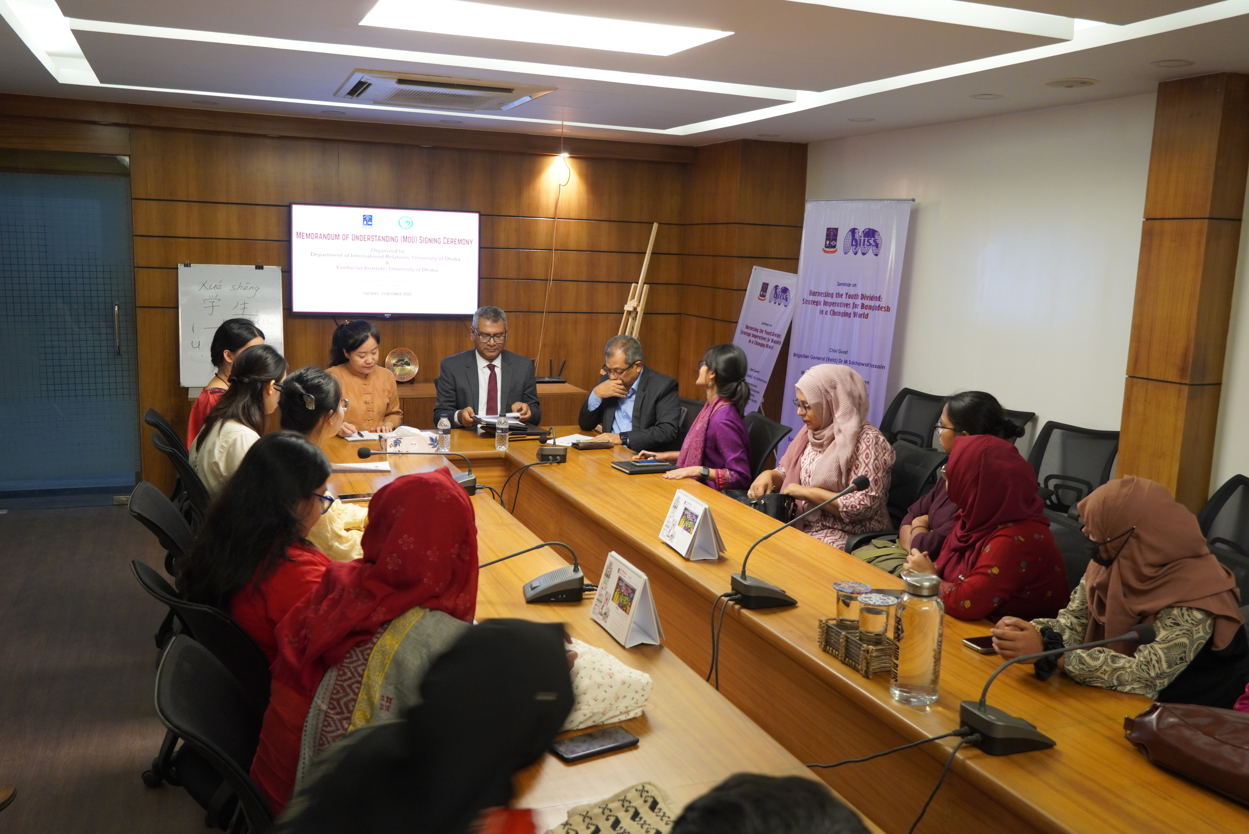 Nearly 40 participants attended the signing ceremony, including Prof. Dr. ASM Ali Ashraf, Chairman of the Department of International Relations, Dr. Delwar Hossain, Professor of International Relations, Dr.Yang Hui, Chinese Director of the Confucius Institute, faculty representatives, and students.