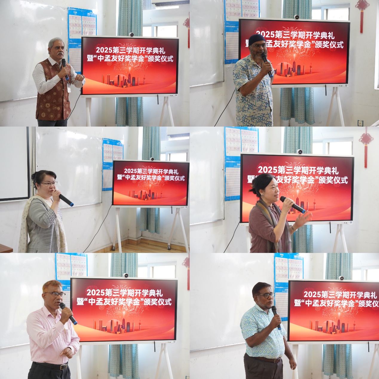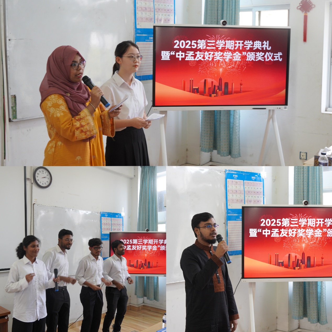 2025年10月26日下午,达卡大学孔子学院成功举办2025年第三学期开学典礼暨“中孟友好奖学金”颁奖仪式。达卡大学注册官孟什·沙姆斯·乌丁·艾哈迈德(Mr. Munshi Shams Uddin Ahmed)、达卡大学中文系教授阿弗扎尔·侯赛因(Prof. Md. Afzal Hossain)、乌东学校校长穆罕默德·阿里夫·拉赫曼(Mr. Muhammad Arifur Rahman)、实验中学校长贾米尔·乌丁(Mr. Md. Jamil Uddin)、孟加拉国华侨华人联合会副秘书长翁远琴女士、达卡孔院中方院长杨惠以及孔院教师、学生等200余人参加活动。新学期新征程,孔院师生们一同见证69名勤奋好学、积极进取的优秀学生获得由在孟中国企业家提供的“中孟友好奖学金”。
