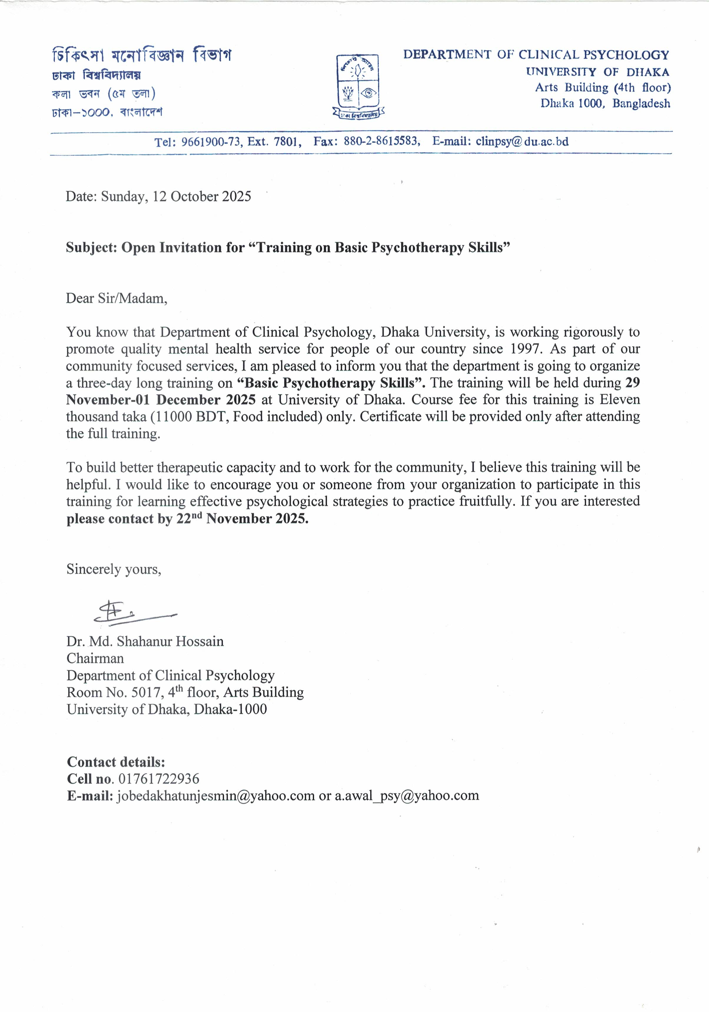 Open invitation for " Training on Basic Psychotherapy Skills"