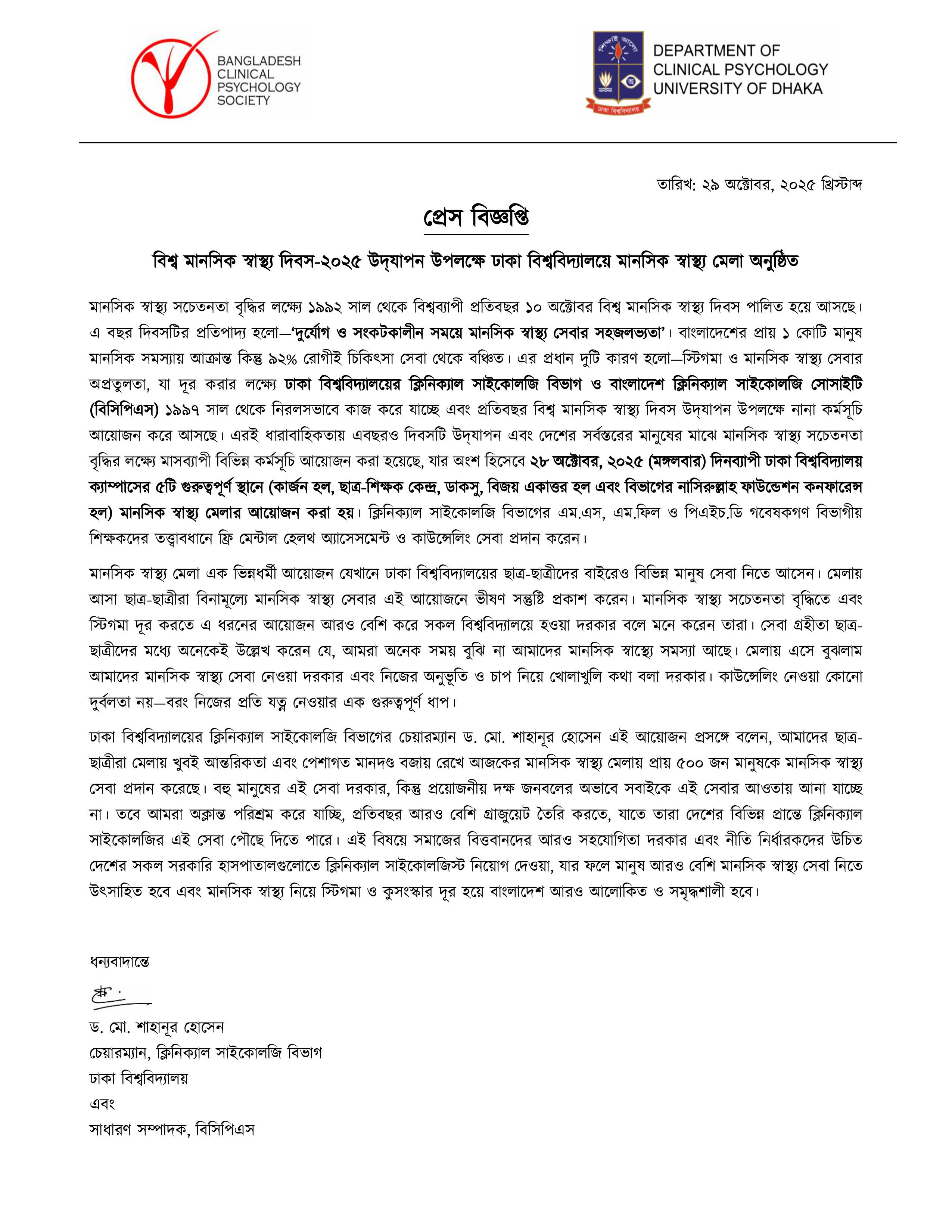 প্রেস বিজ্ঞপ্তি, বিশ্ব মানসিক স্বাস্থ্য দিবস-২০২৫ উদ্যাপন