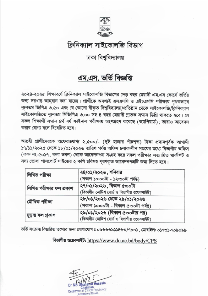 ঢাকা বিশ্ববিদ্যালয়ের ক্লিনিক্যাল সাইকোলজি বিভাগ কর্তৃক প্রকাশিত ২০২৪–২০২৫ শিক্ষাবর্ষের এম.এস. কোর্সে ভর্তি বিজ্ঞপ্তি