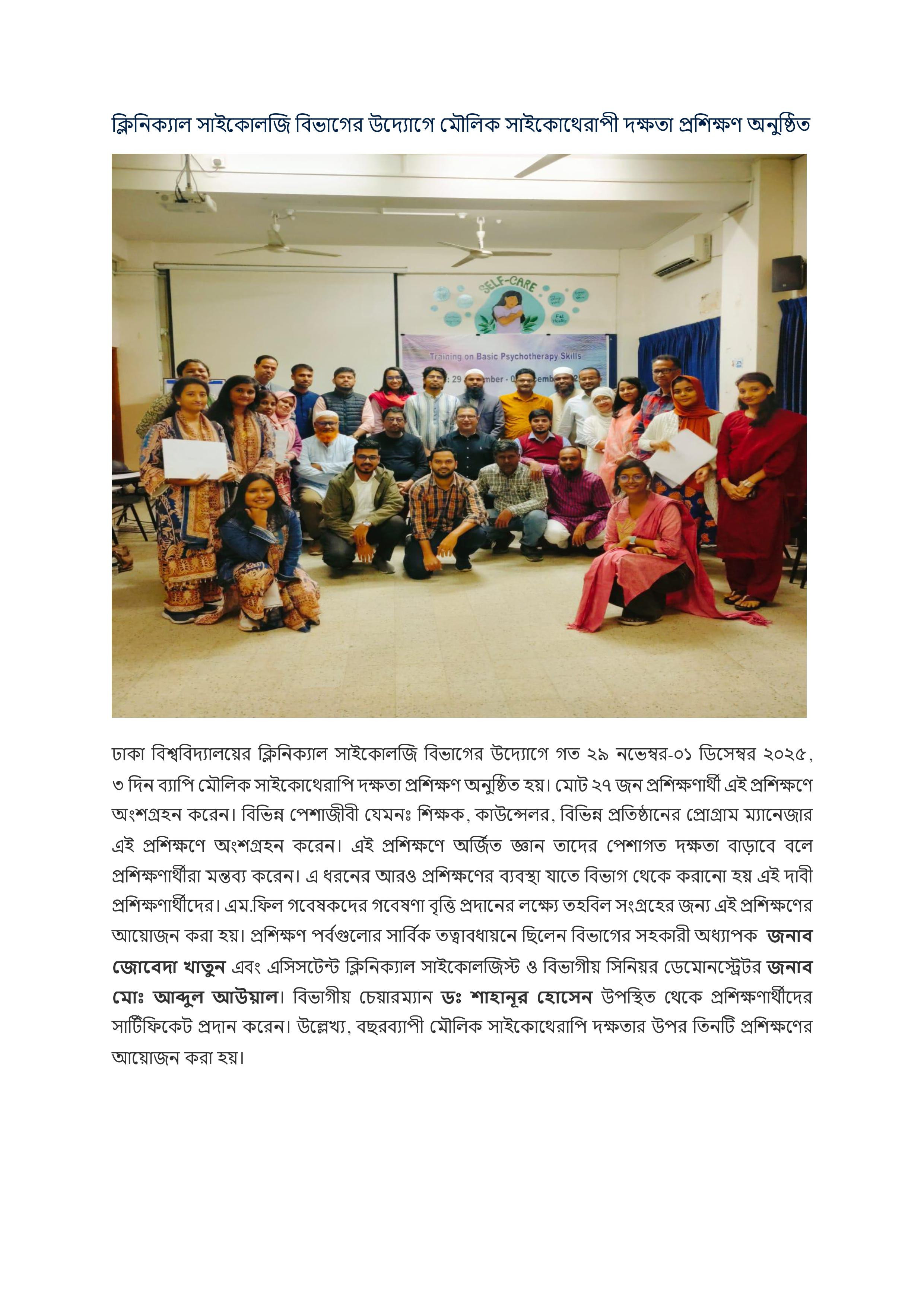 ক্লিনিক্যাল সাইকোলজি বিভাগের উদ্যোগে মৌলিক সাইকোথেরাপী দক্ষতা প্রশিক্ষণ অনুষ্ঠিত