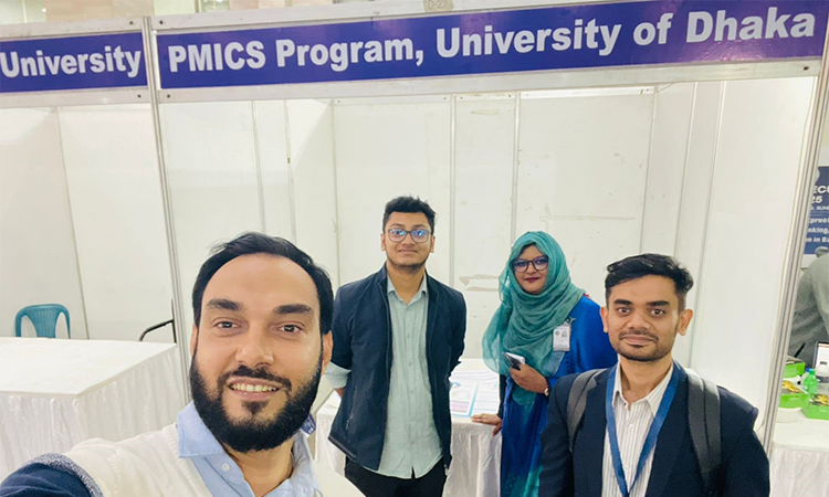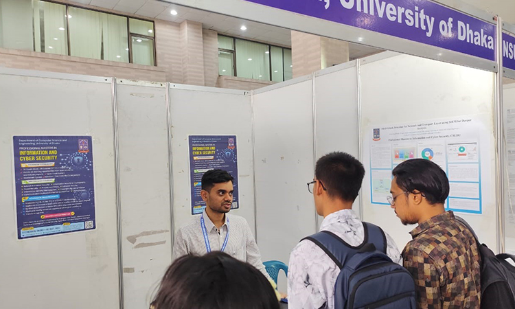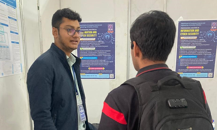 Beyond research, the PMICS program itself became a focal point of interest. Prospective learners approached the DU representatives to understand the curriculum structure, course diversity, specialization opportunities, and the practical skill-building components embedded within the program. Discussions naturally expanded to broader topics such as the future of cybersecurity in Bangladesh, global career prospects, capacity-building challenges, and the urgent need for skilled professionals.