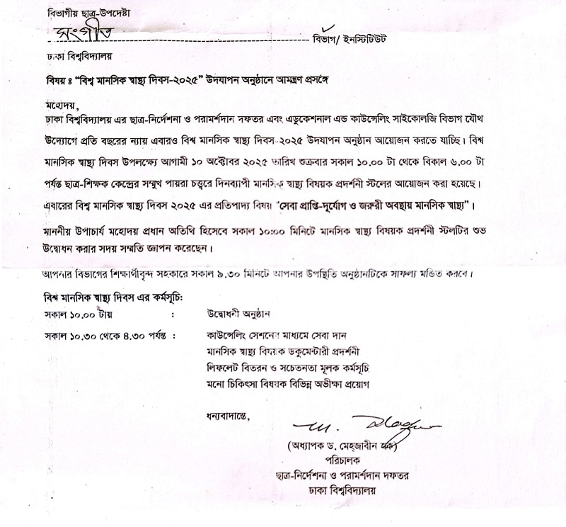 “বিশ্ব মানসিক স্বাস্থ্য দিবস -২০২৫ ‘’ উদযাপন অনুষ্ঠানে আমন্ত্রণ প্রসঙ্গে ।