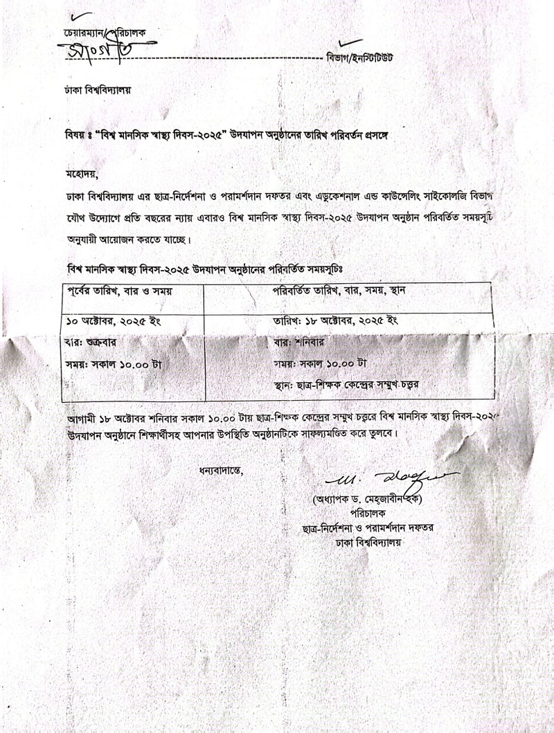 “বিশ্ব মানসিক স্বাস্থ্য দিবস -২০২৫ ‘’ উদযাপন অনুষ্ঠানের তারিখ পরিবর্তন প্রসঙ্গে।