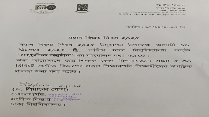 মহান বিজয় দিবস ২০২৫ উপলক্ষে আগামী ১৬ ডিসেম্বর ২০২৫ তারিখ ,ঢাকা বিশ্ববিদ্যালয় কর্তৃক সাংস্কৃতিক অনুষ্ঠানের আয়োজন করা হয়েছে । উক্ত অনুষ্ঠানে সংগীত বিভাগের সকল ছাত্রছাত্রীদের ৫.৩০ মিনিটে ছাত্র-শিক্ষক মিলনায়তনে উপস্থিত থাকার জন্য বলা হচ্ছে।