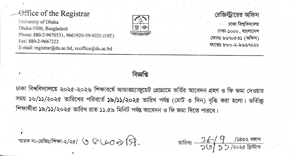 ২০২৫-২০২৬ শিক্ষাবর্ষে আন্ডারগ্র্যাজুয়েট প্রোগ্রামে ভর্তির আবেদন সময় বৃদ্ধি প্রসঙ্গে