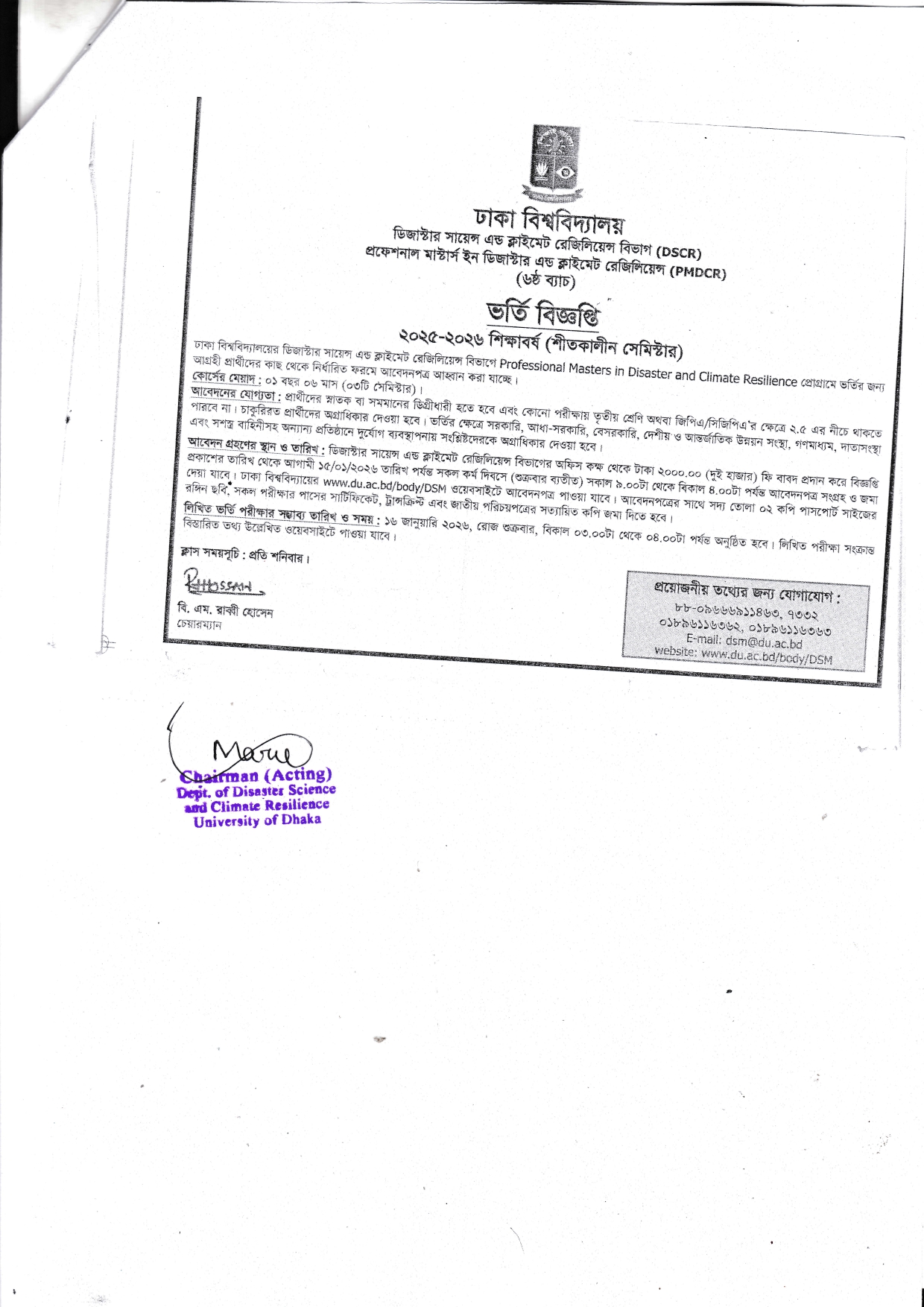 প্রফেশনাল মাস্টার্স ইন ডিজাস্টার সায়েন্স এন্ড ক্লাইমেট রেজিলিয়েন্স প্রোগ্রামে (৬ষ্ঠ ব্যাচ, শীতকালীন সেমিস্টার) ভর্তি বিজ্ঞপ্তি