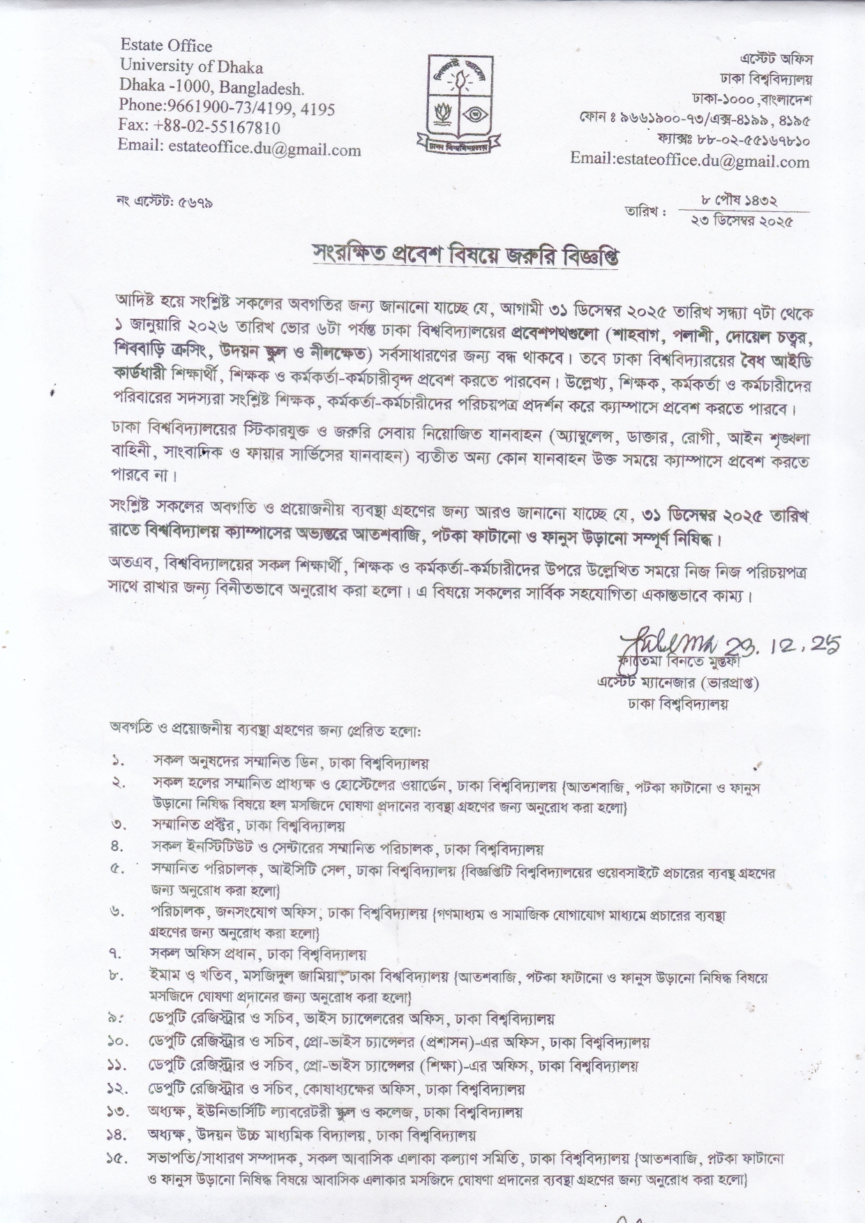 আগামী ২০ ডিসেম্বর ২০২৫ তারিখে বিশ্ববিদ্যালয়ের অভ্যন্তরীণ ও অধিভুক্ত/ উপাদানকল্প কলেজ/ ইনস্টিটিউট কেন্দ্রে কোন পরীক্ষা অনুষ্ঠিত হবে না
