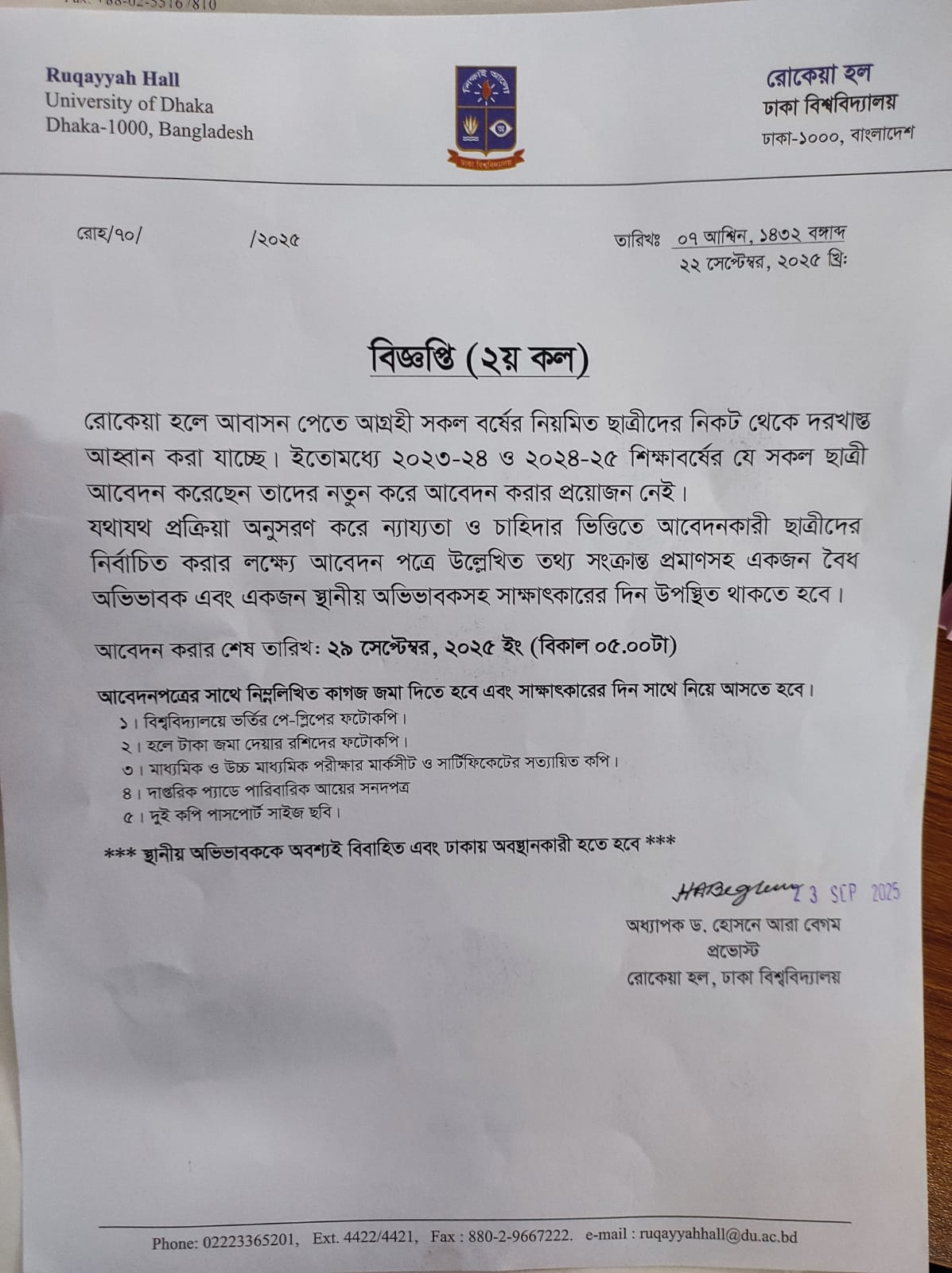 রোকেয়া হলে নিয়মিত ছাত্রীদের নিকট থেকে দরখাস্ত আহ্বান প্রসঙ্গে বিজ্ঞপ্তি(২য় কল)।