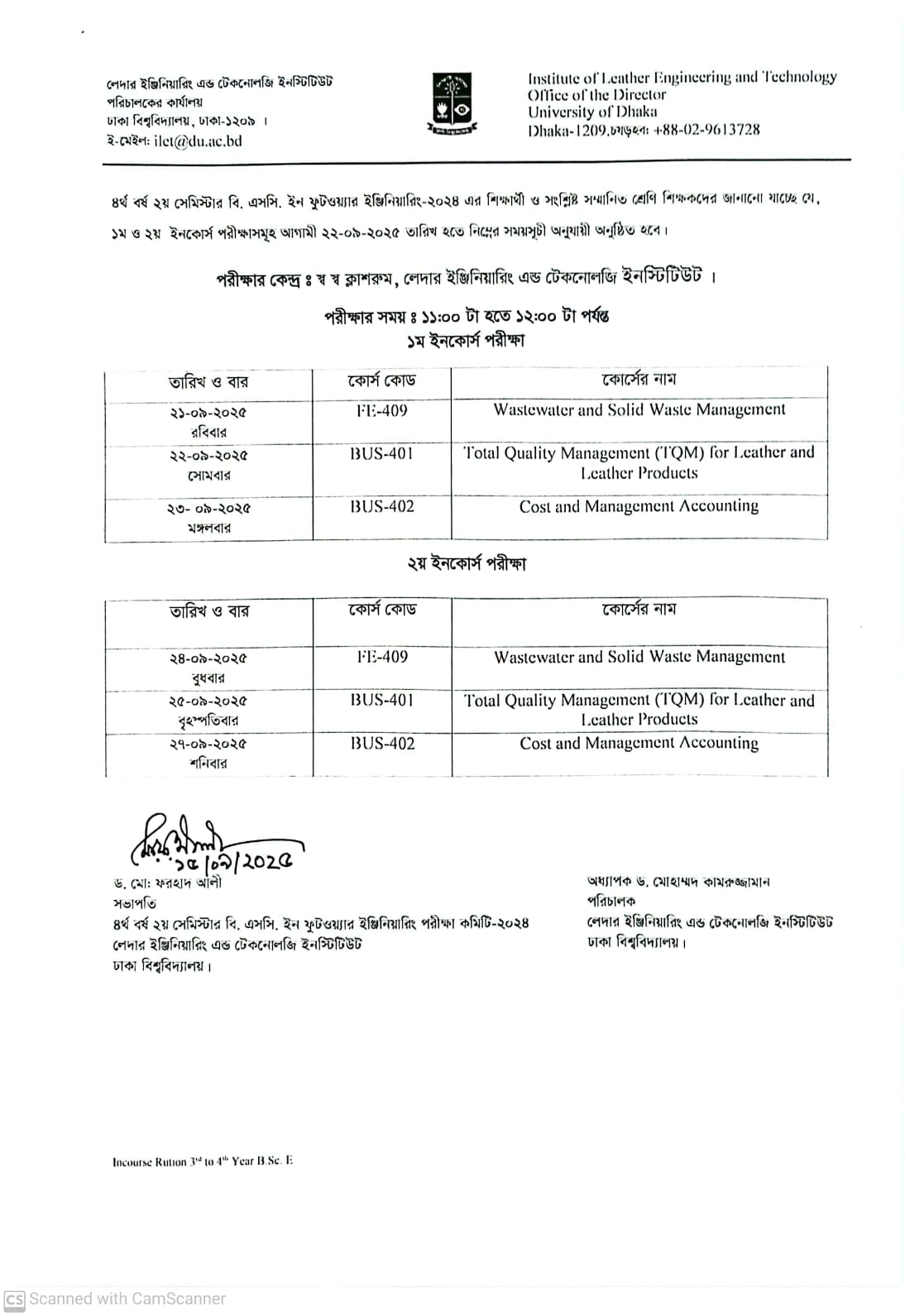 1st Year 1st Semester B.Sc. in FE-2025: incourse exam schedule