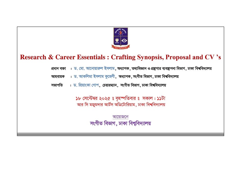সংগীত বিভাগ আয়োজিত ’’Research and Career Essentials: Crafting synopsis proposal and CV's ”সেমিনারটি অনুষ্ঠিত হবে আগামিকাল সকাল ১১:০০ টায় আরসি মজুমদার মিলনায়তনে । ,