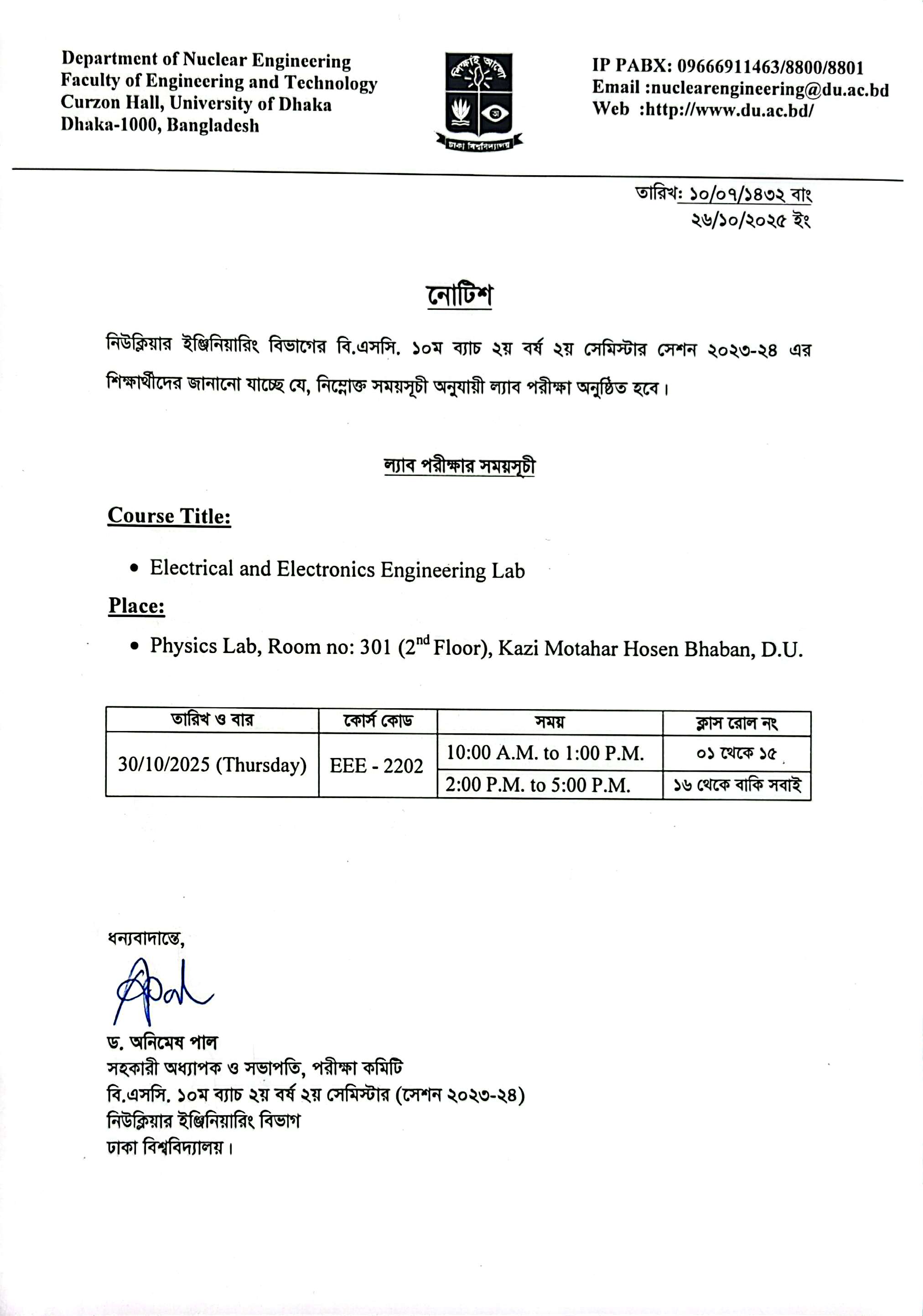 বি.এসসি. ১২তম ব্যাচ ১ম সেমিস্টার ল্যাব ফাইনাল পরীক্ষার রুটিন