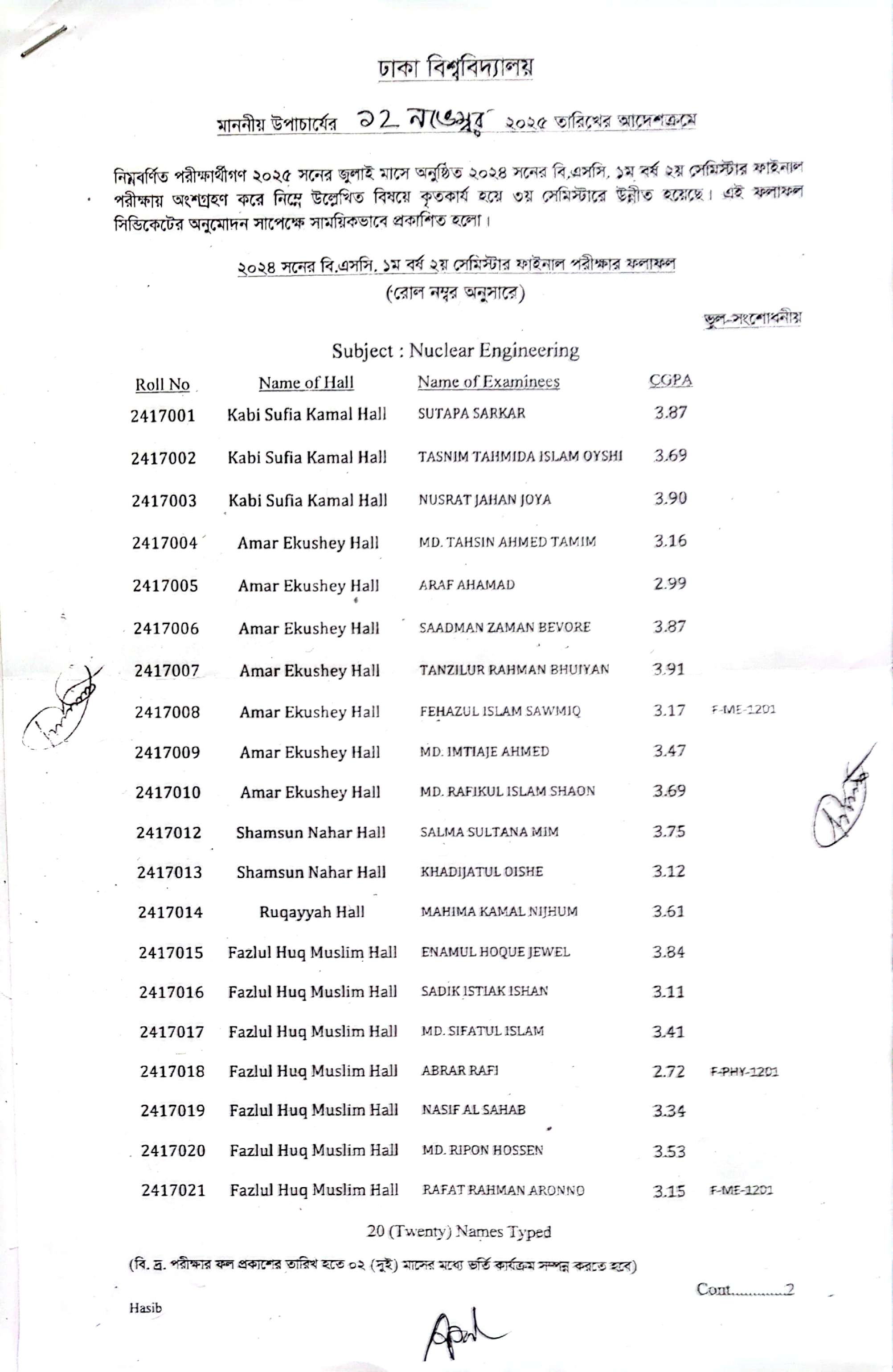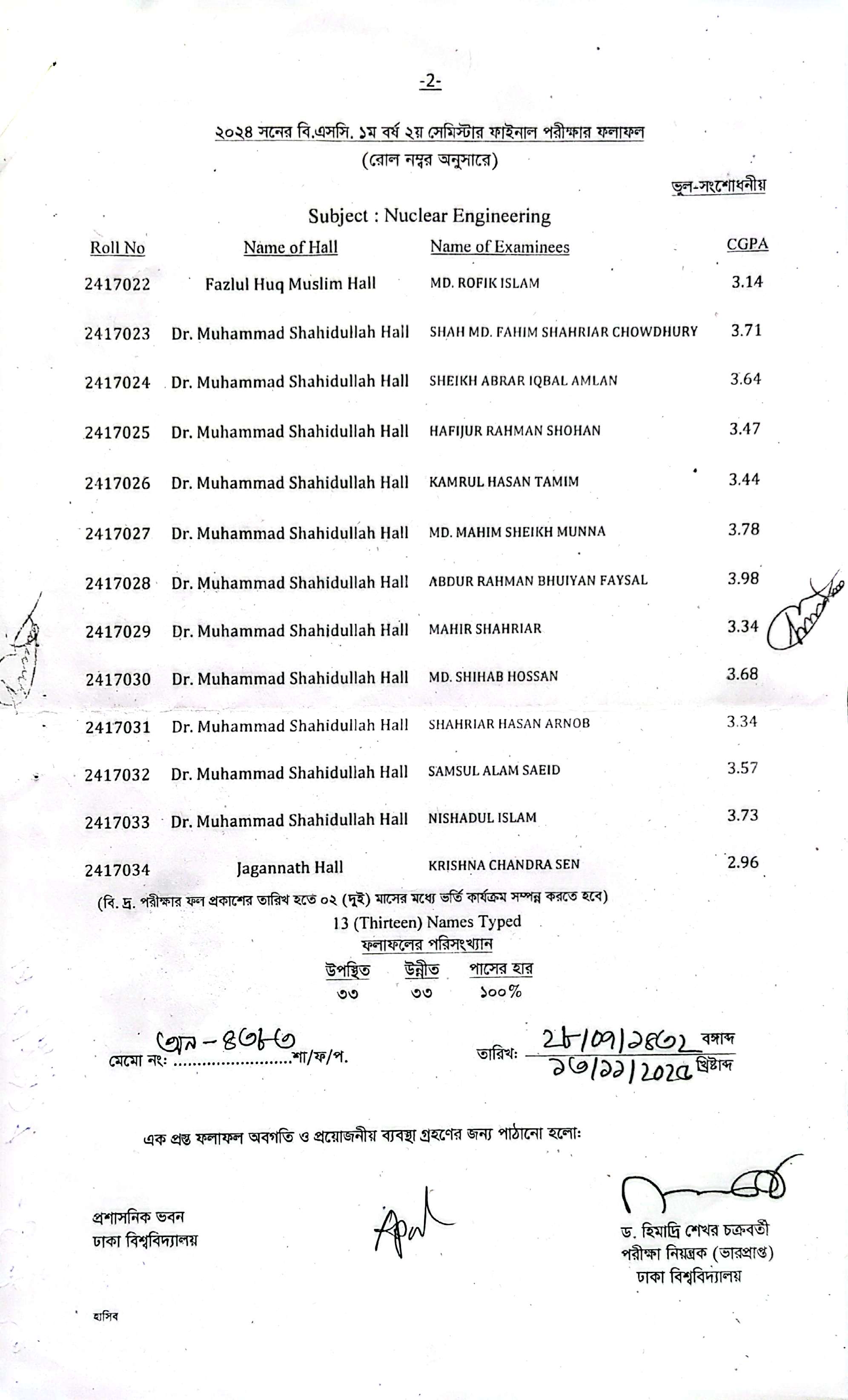 বি.এসসি. ১১তম ব্যাচ ১ম বর্ষ ২য় সেমিস্টার ফাইনাল পরীক্ষার ফলাফল