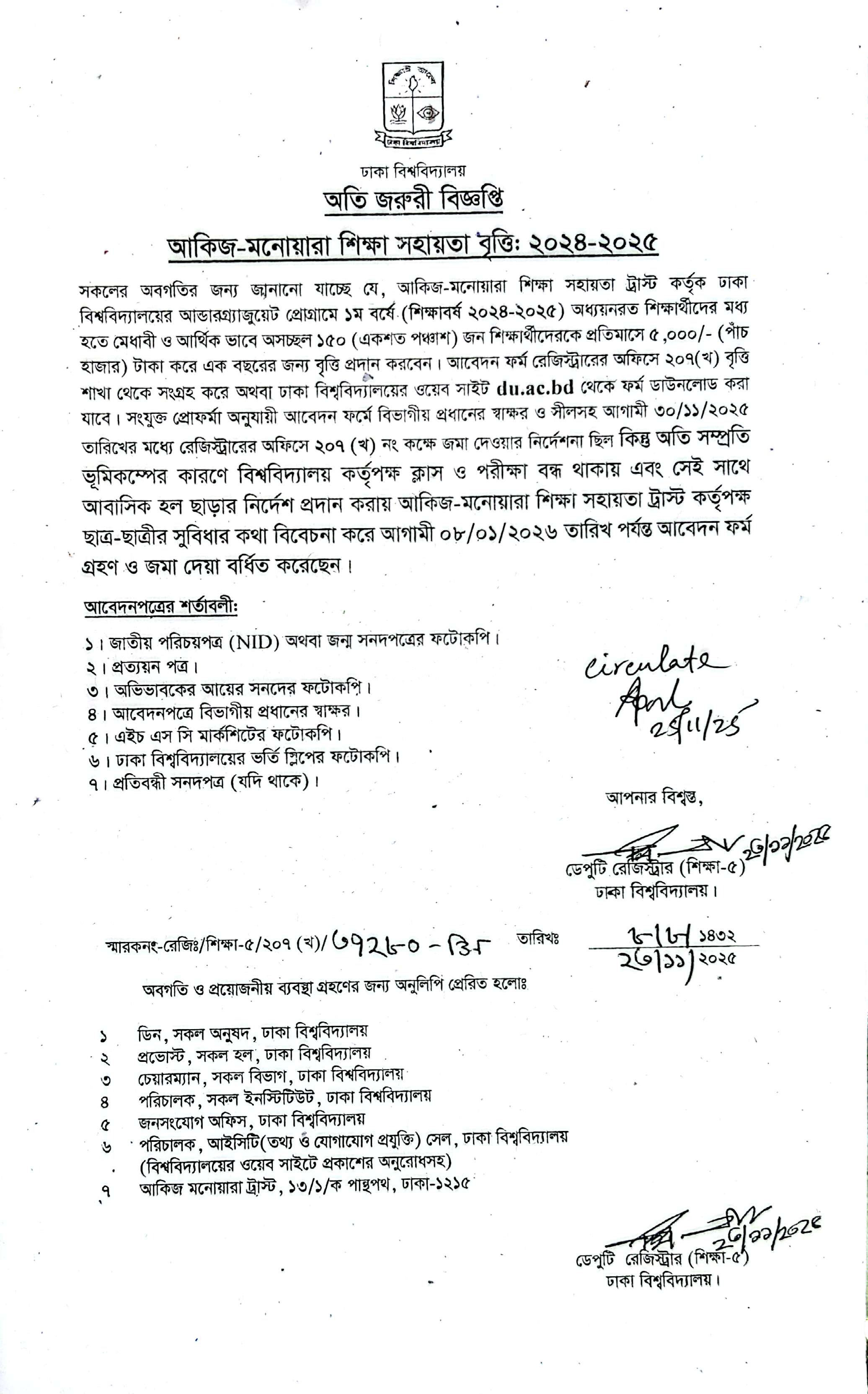 আকিজ মনোয়ারা শিক্ষা সহায়তা বৃত্তি ২০২৪-২৫