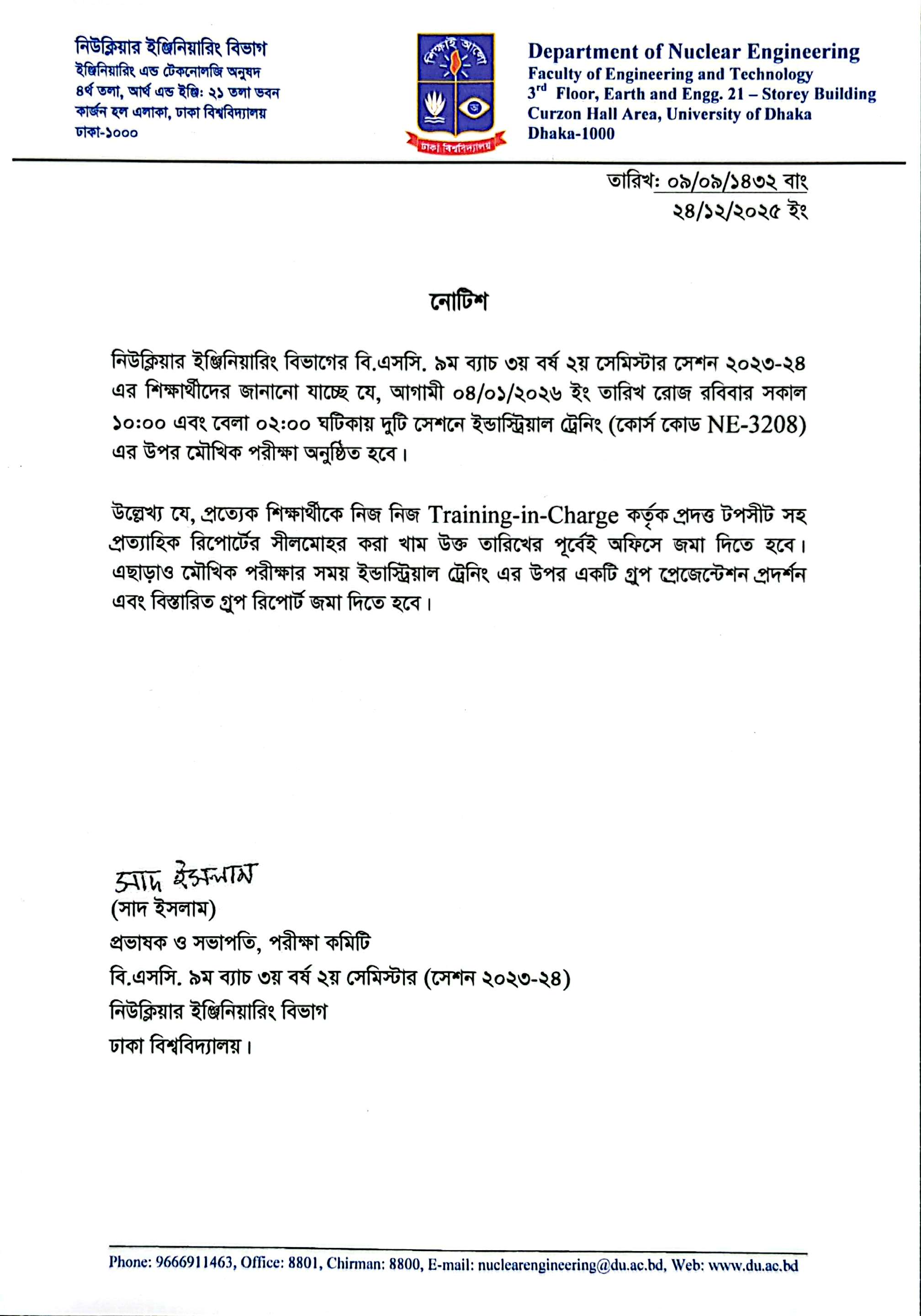 বি.এসসি. ৩য় বর্ষ ২য় সেমিস্টার ইন্ডাস্ট্রিয়াল ট্রেনিং এর মৌখিক পরীক্ষা এবং পরীক্ষার সময়সূচি