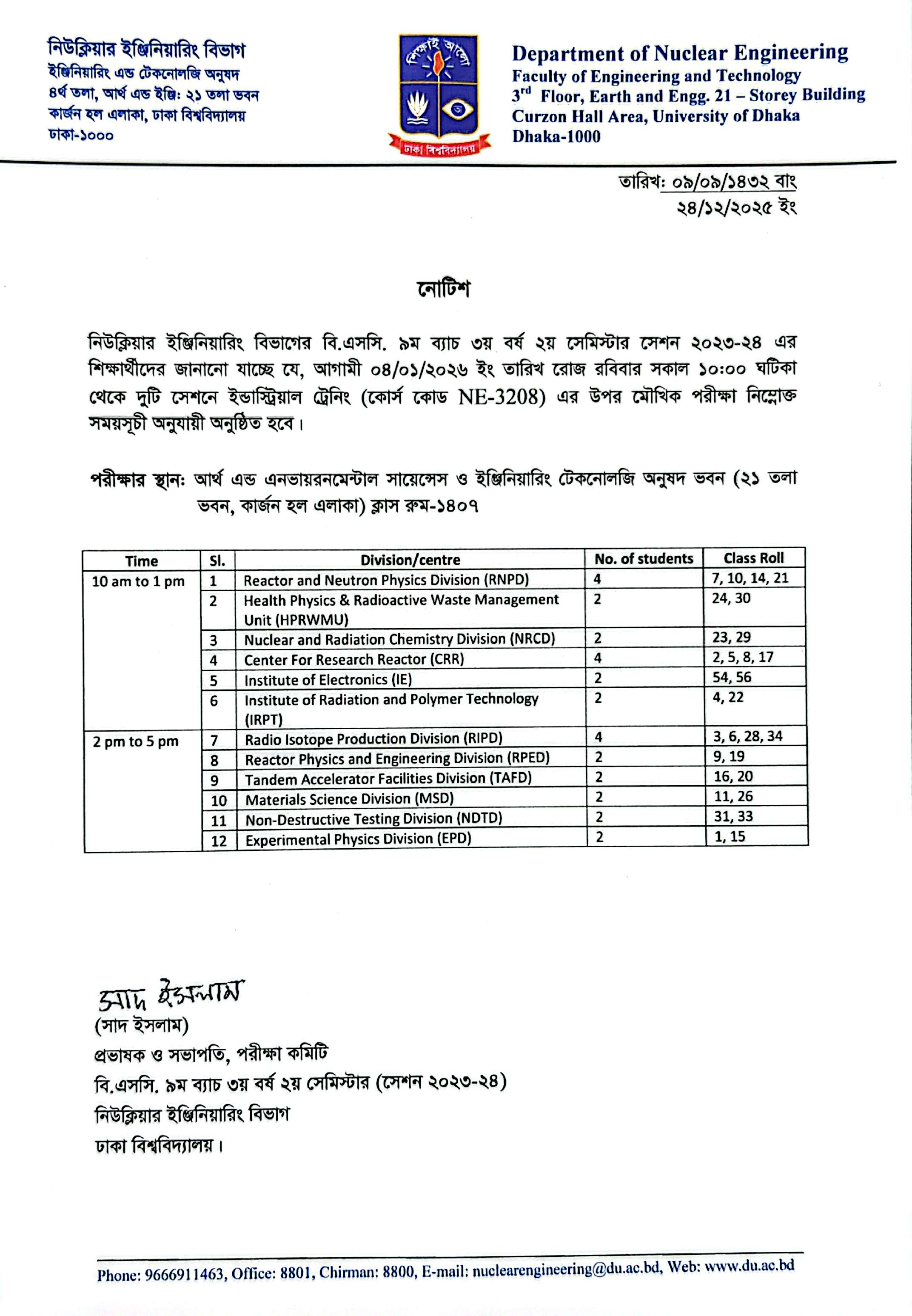বি.এসসি. ৯ম ব্যাচ ৩য় সেমিস্টার পরিবর্তিত ফাইনাল পরীক্ষার রুটিন