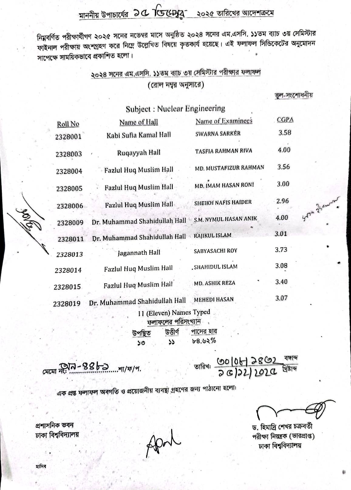 এম.এসসি. ১১তম ব্যাচ ৩য় সেমিস্টার ফাইনাল পরীক্ষার ফলাফল সংক্রান্ত