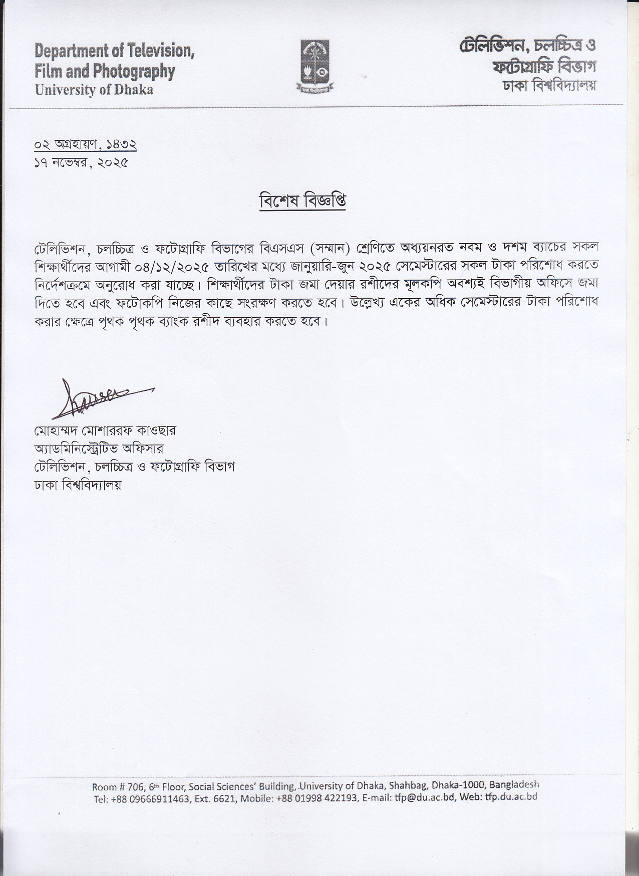 বিশেষ বিজ্ঞপ্তি: সেমিস্টার ফি সংক্রান্ত (বিএসএস ৯ম ও ১০ম ব্যাচ)