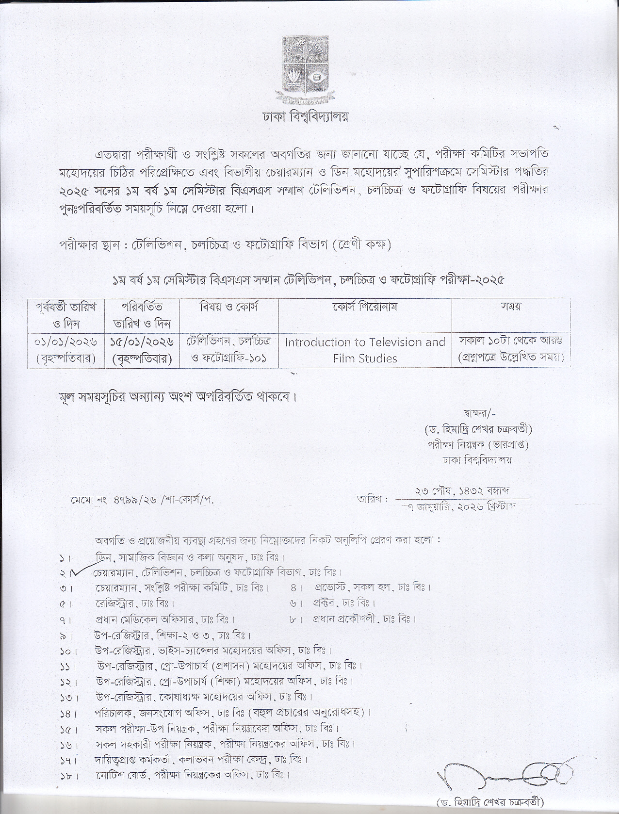 বিএসএস ১২তম ব্যাচ ১ম সেমিস্টার পরীক্ষার পুনঃপরিবর্তিত সময়সূচি