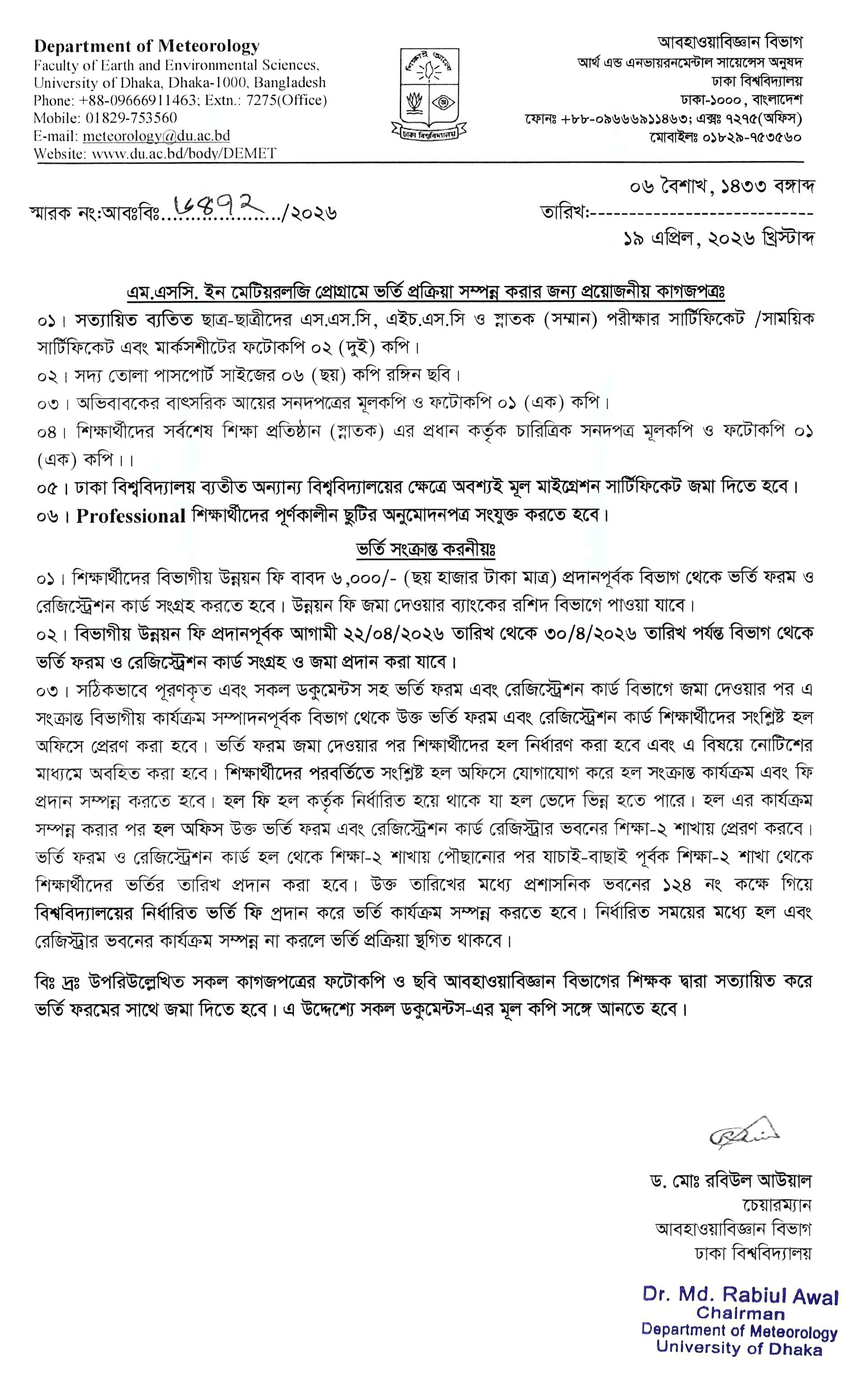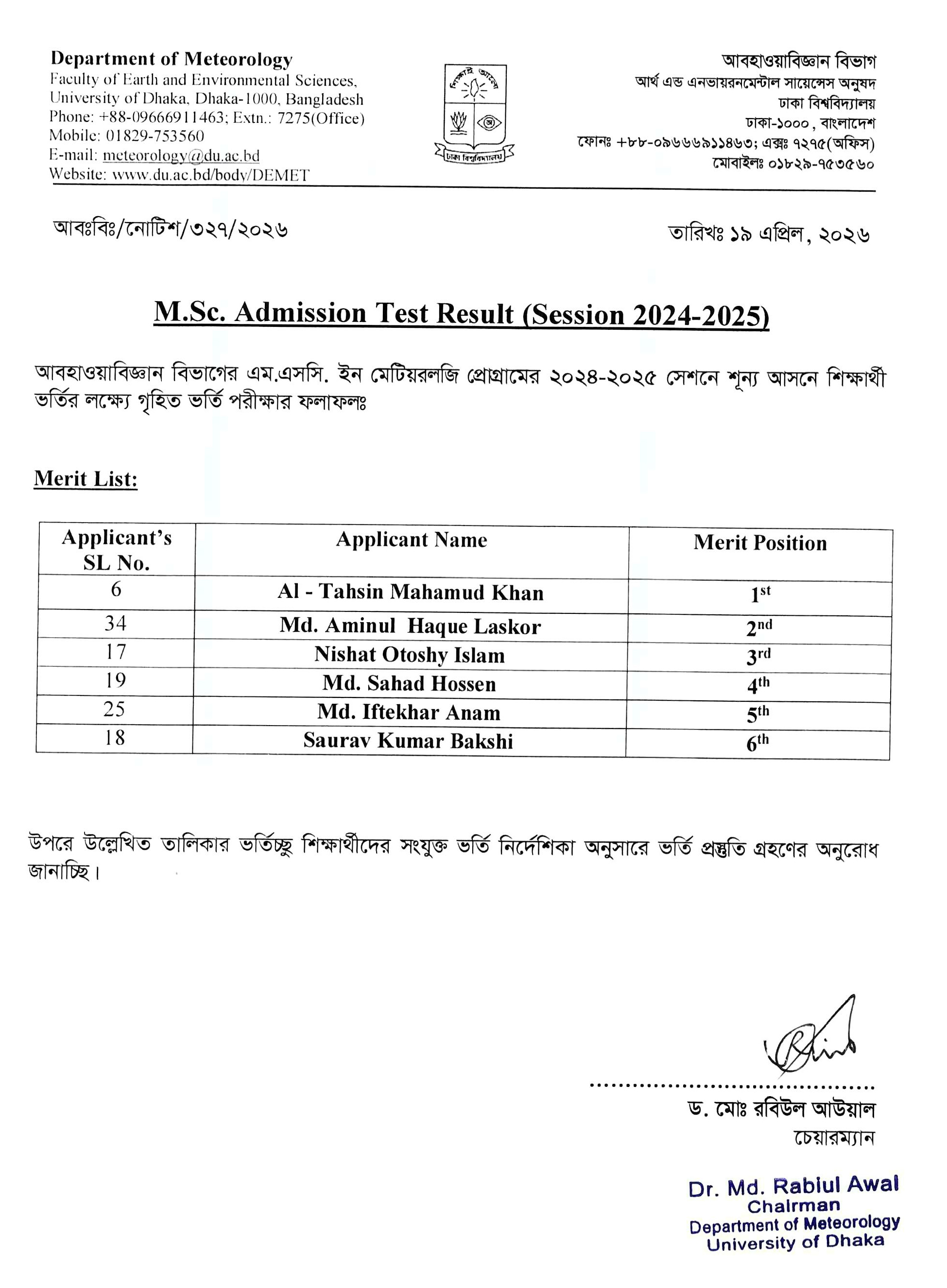 M.Sc. in Meteorology (2024–25) Written Result Published at University of Dhaka