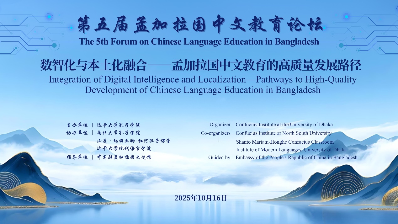 2025年10月16日 ,由达卡大学孔子学院主办,南北大学孔子学院、山度·玛丽亚姆-红河孔子课堂及达卡大学现代语言学院协办,中国驻孟加拉国大使馆的指导的第五届孟加拉国中文教育论坛在达卡大学现代语言学院礼堂成功举办。本届论坛以“数智化与本土化融合——孟加拉国中文教育的高质量发展路径”为主题,吸引了来自中孟两国逾百名教育官员、学者、一线教师和中文学习者参与,共商中文教育发展大计。