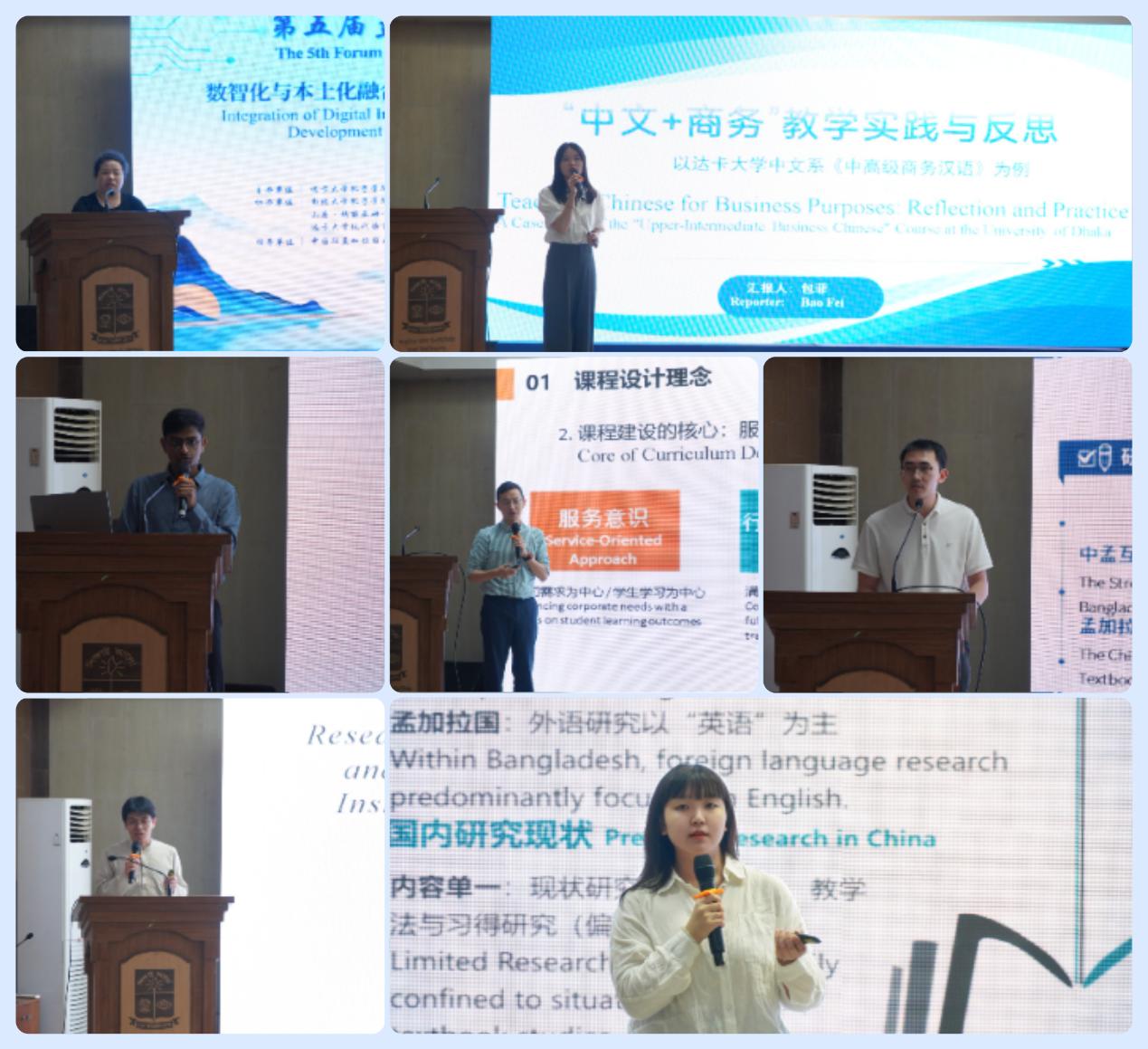 随后的专题研讨环节内容丰富,讨论热烈。第一研讨阶段由达卡大学中文系助理教授张娜主持,教师们从多维度探讨了中文教育的发展。达卡大学Mohammad Mainul Islam教授阐述了中孟教育合作对释放孟加拉国人口红利的战略意义;山度·玛丽亚姆-红河孔子课堂单金涛老师剖析了在线与混合式教学模式在孟加拉国面临的实践挑战;南北大学孔子学院赵天彬则聚焦人工智能在中文听说技能教学中的具体应用策略;达卡大学孔子学院本土教师妮鲁和南北大学孔子学院刘雅楠分别就教学本土化实践和“中文+商务”教学模式分享了宝贵的探索经验。