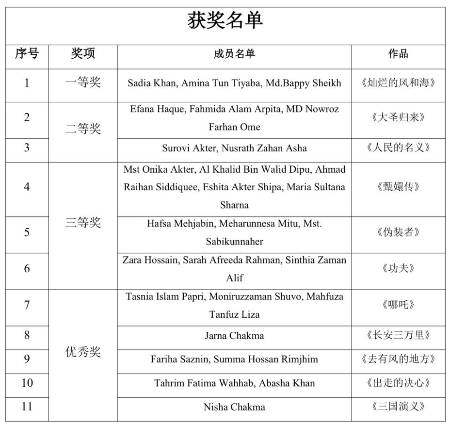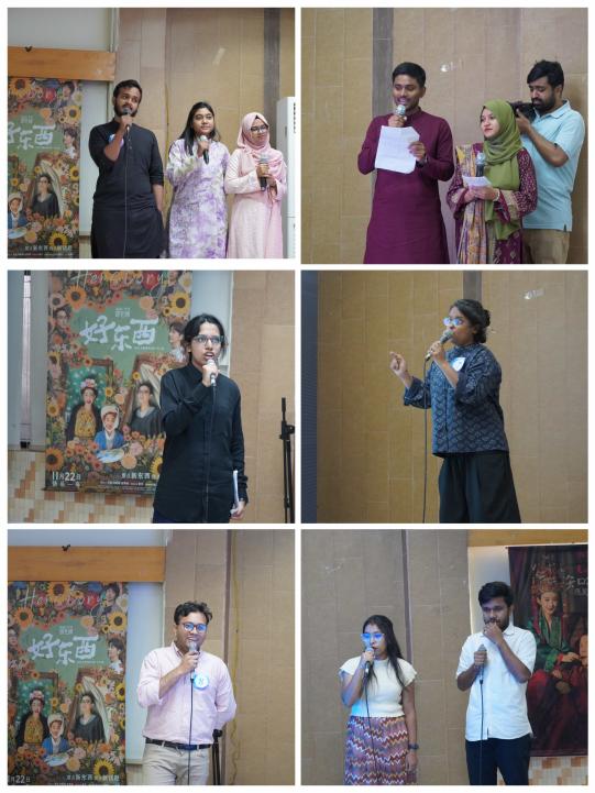 本次配音大赛以“声临其境”为主题,创新性地将中国影视剧与中文学习相结合。自活动启动以来,得到了来自达卡大学孔子学院、南北大学孔子学院、山度·玛丽亚姆-红河孔子课堂及达卡大学中文系学生们的积极响应,共有24组(66人)选手报名参赛。经过前期初赛选拔,最终11组(28人)选手脱颖而出,晋级本次决赛。